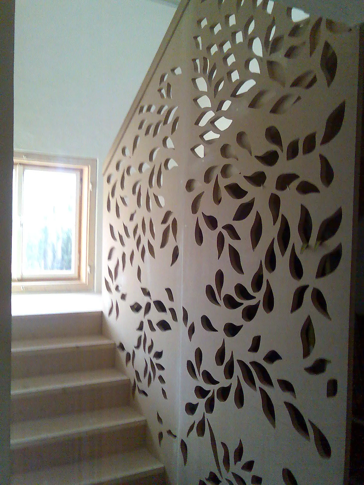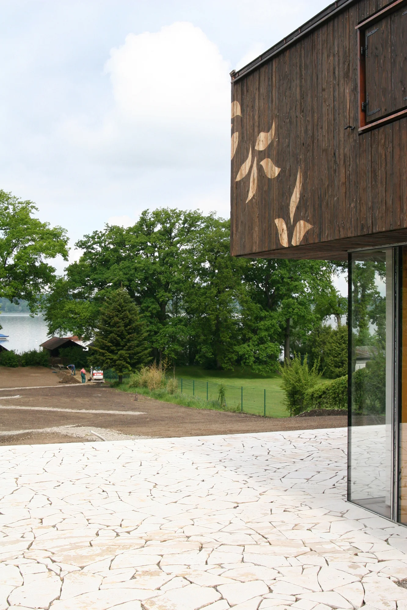 Das Ornament wird als „schmückendes" Fassadenthema aufgegriffen und ironisiert. Die 200 fache Vergrößerung eines bayerischen „Dirndlmusters" schafft eine ornamentale Vertrautheit, zugleich zeigt der Maßstabssprung sowie die Darstellung eines Ausschnittes ein neue Kompositionsform und wirkt daher alles andere als klassisch oder rustikal. Das Ornament wurde per Computer aus einer selbstklebenden Kunststoff- Folie ausgeschnitten. Die fertig gestrichene Holzfassade wurde der Negativfolie beklebt und Sandgestrahlt. So trat die helle ungeschützte Holzfassade im Bereich des Ornamentes zu Tage. Wie bei Bootshäusern am Ammersee, bekommt die ungeschützte Ornamentstruktur durch den Witterungsprozeß einen silbrig- grauen Glanz und wird mit den Jahren immer subtiler. Das Haus empfängt einem mit „altem Kleide" und blickt zum See mit „neuem Gewand".