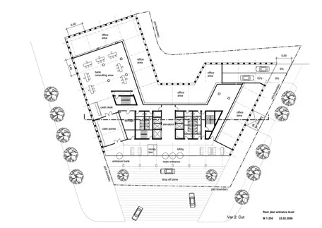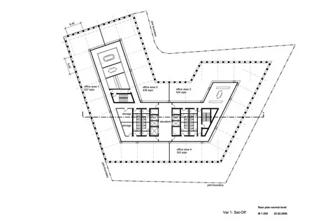 Der Grundriss ist Kompakt mit einer guten Flächenausnutzung und bietet Raum für großzügige Nutzungseinheiten. Insgesamt hat das Gebäude 16 Geschosse 7 Geschosse im massiven Sockel, 1 Konferenzgeschoss und 8 vollverglaste Büro-geschosse mit Blick über die Stadt.