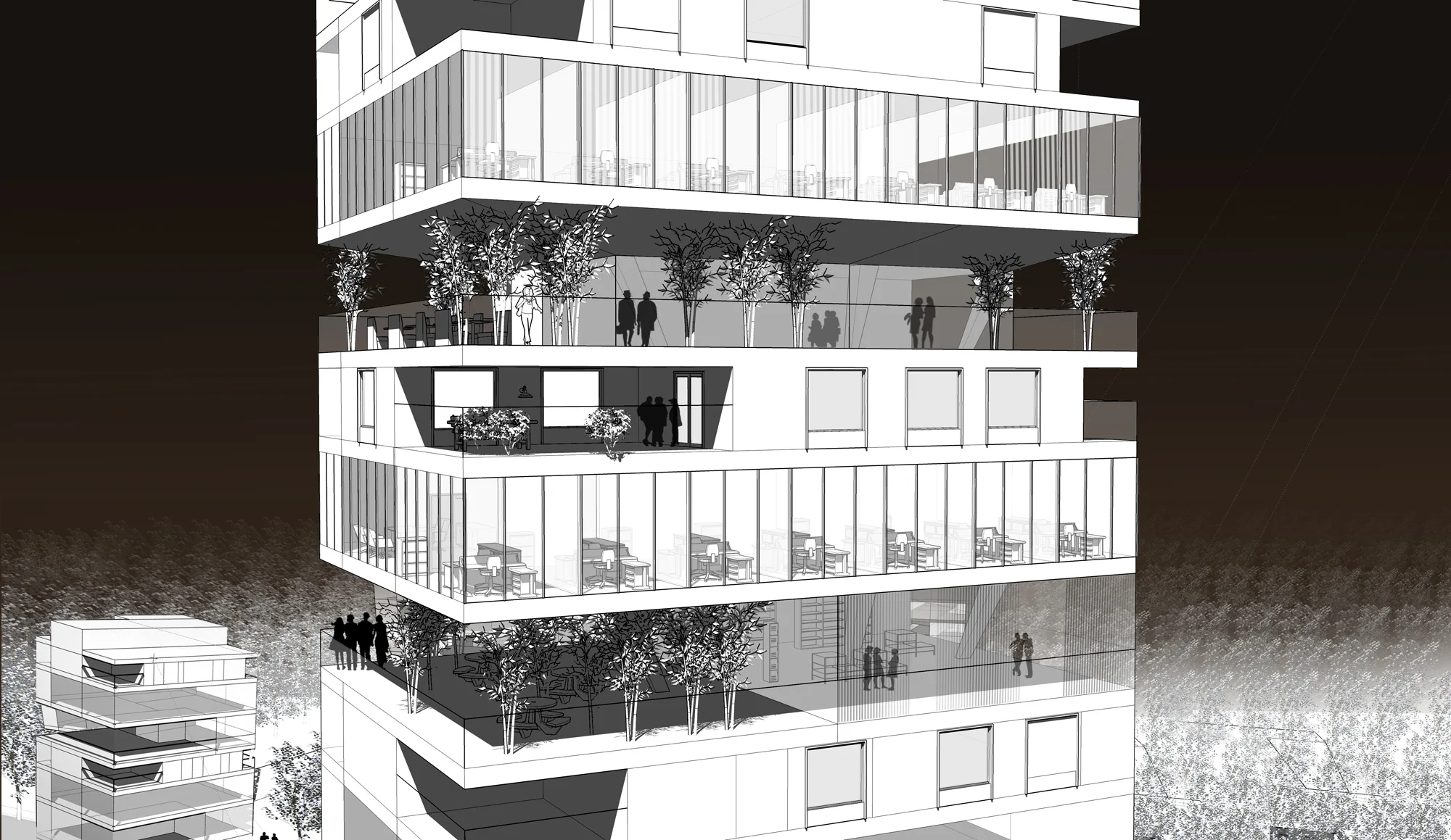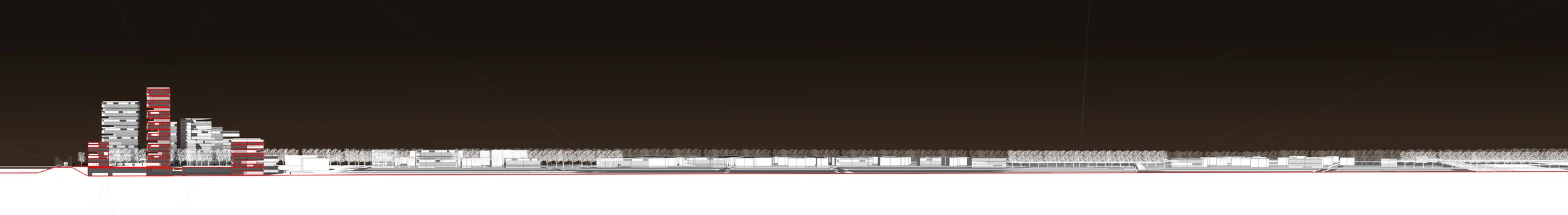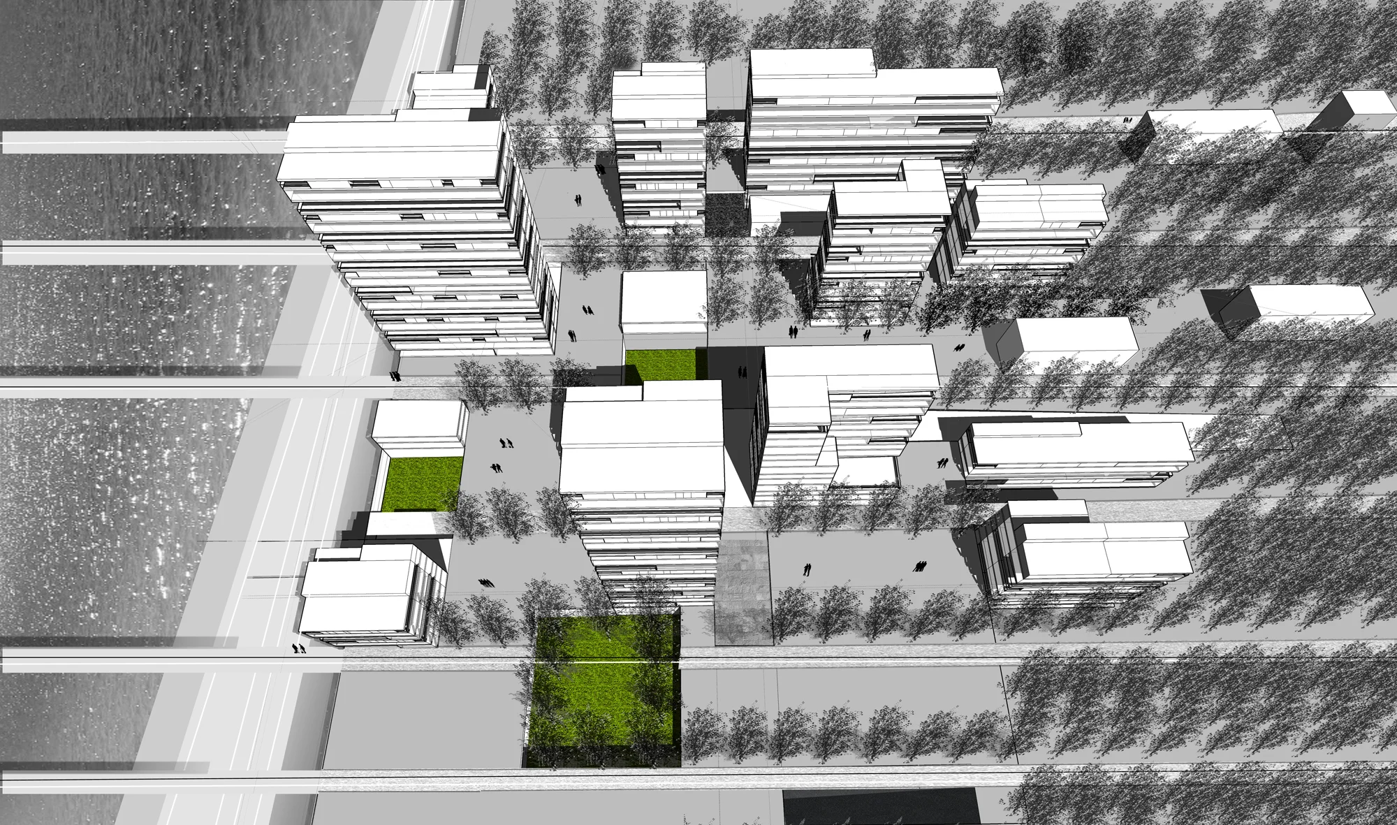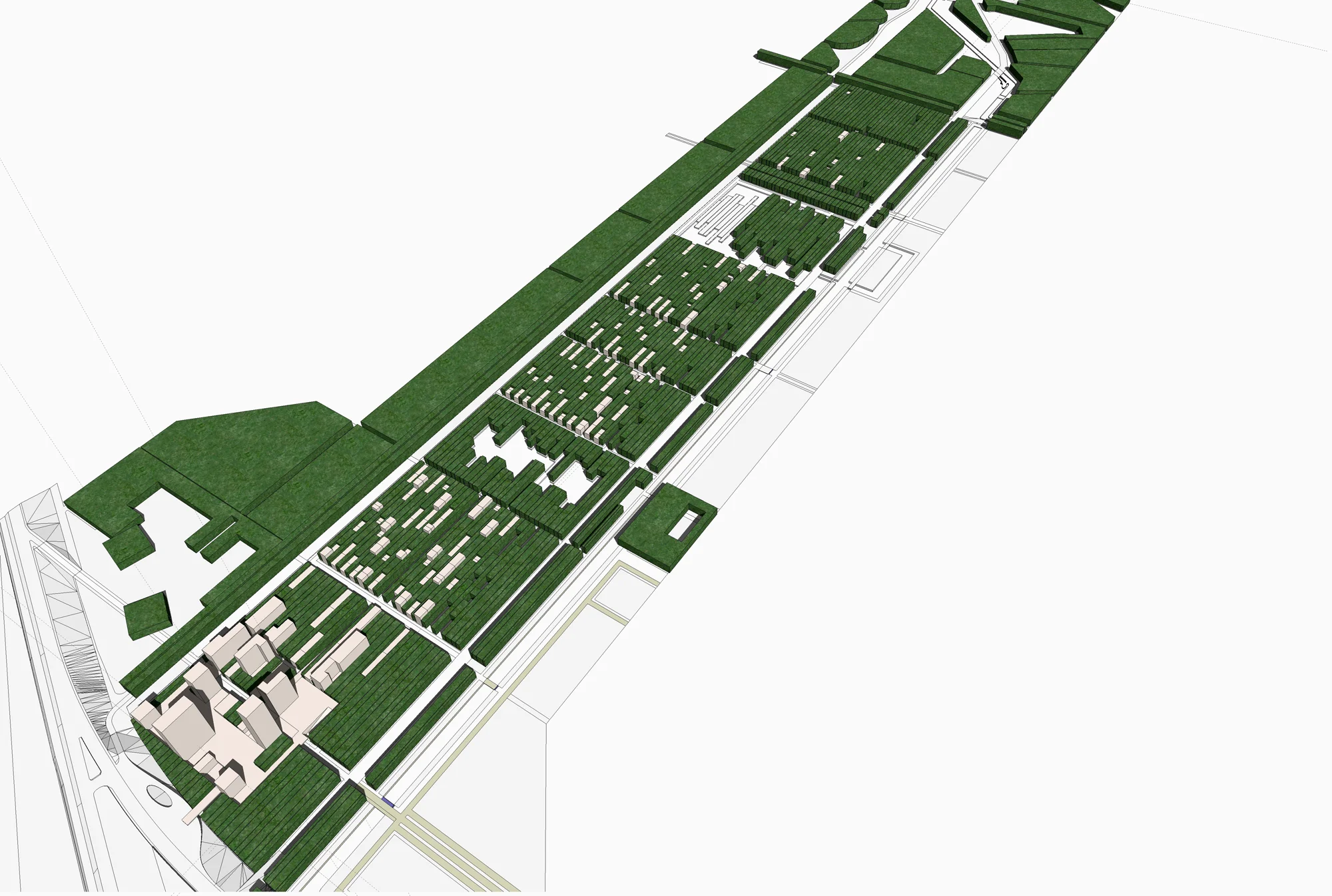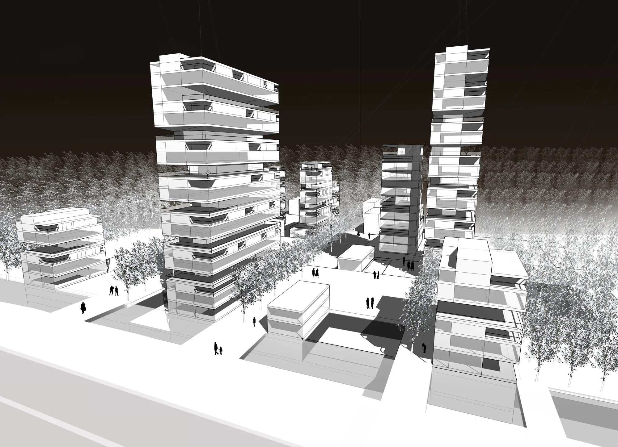 The natural potential of the site is its rigid pattern of trees. The adjacency to the sea is disguised by the dike, acting as a new future boulevard, connecting the site to its environment. A new sustainable town, socially and naturally, shall be build at this prominent location. Retaining the dense woodland character and using the potential of the prominent open maritim ambiance is the aim of the concept. On a social level a sustainable urban neighbourhood consists of a mixture of young, old, rich and poor inhabitants. The urban concept should aim to initialise this mixture by providing space for every social level. On a commercial level, a mixture of uses should be aspired. A balanced relation between housing, commerce and public functions will act as a motor to the development and basis for the daily well-being of the site. „Between the lines" will use the rigid pattern of the trees to create an urban carpet as anchor for step by step organic develop-ment. The already existing structure of the woodland will be amplified by a structure of walkways merging the whole site to one unit and connecting the east of the site with the sea. Within this framework different districts are defined, allowing a maximum plot size, density, mix of use and hight of building. The position and size of the individual plot is free to choose, depending on the wishes of the private or public investors. The rules are projected on the districts as a whole. This means that the first developers will have the free choice to generate their project, whereas the potential for last plot in one district is restricted by the already deve-loped plots. As a starting point the whole woodland is seen as public space. As private developers start to buy plots, more or less scattered private islands are evolving: Islands of privacy in a sea of public forest.