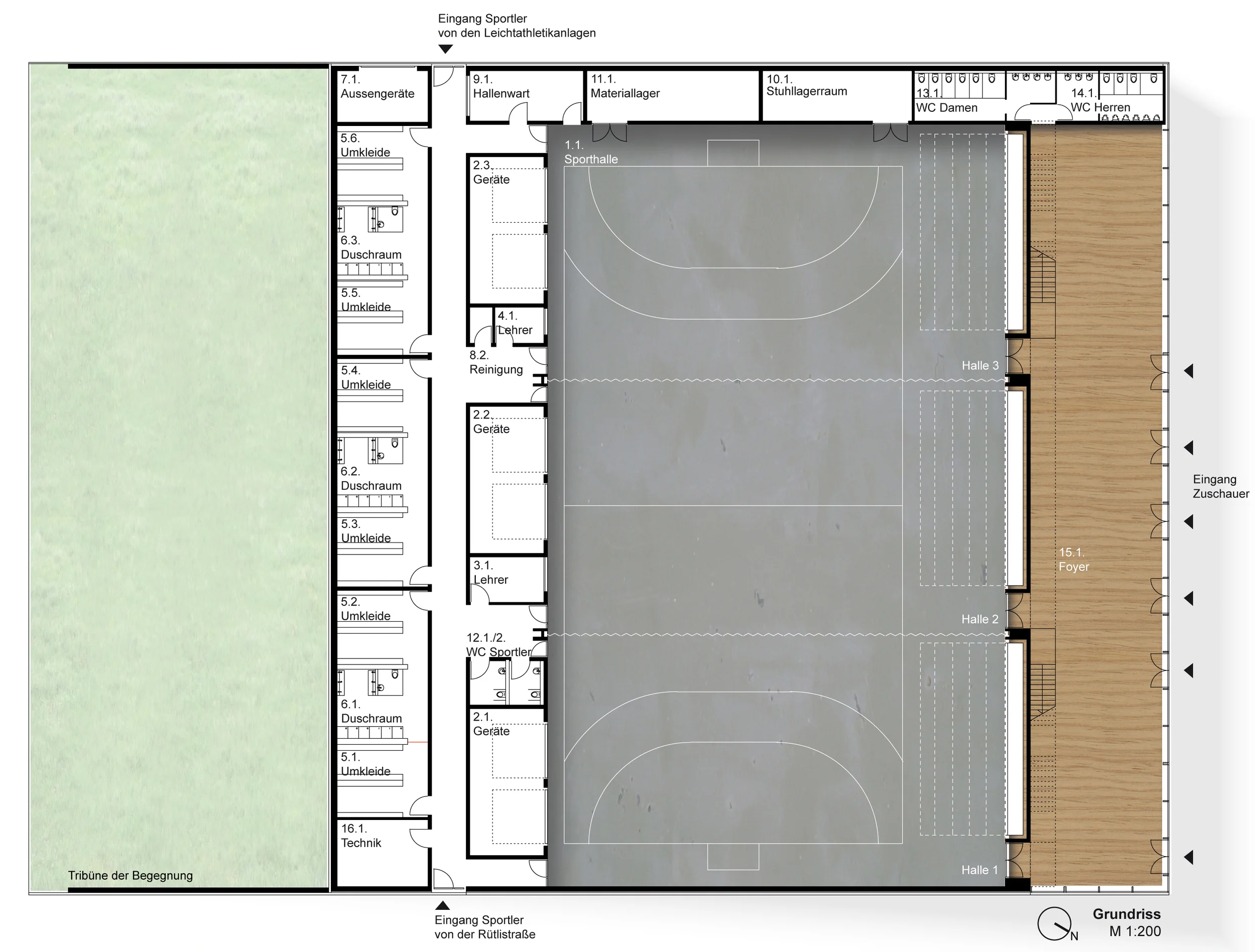 Die Quartiersporthalle des Campus Rütli ist Landschaft und Sporthalle zugleich. Nach Norden öffnet sich die Halle zur Straße hin mit seinem einladenden und großen Foyer, das somit Teil der Straße wird, während das Hallendach nach Süden hin abfällt und Teil des Sport- und Freizeitparks wird.