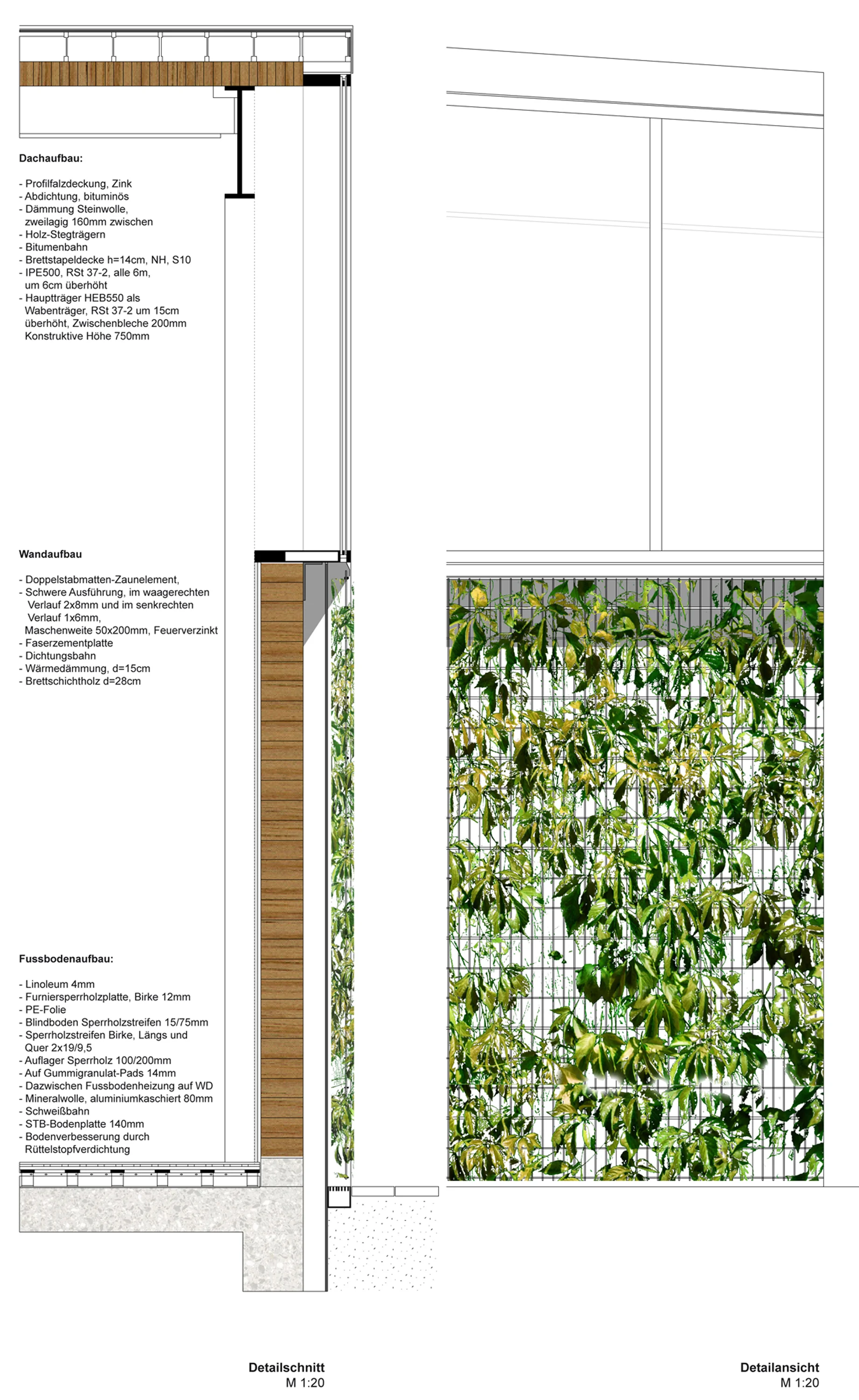 Das außergewöhnliche Erscheinungsbild der Halle als Landschaftstribüne wird durch die besondere begrünte Fassadengestaltung unterstützt, die den gesamten Baukörper der Halle umschließt. Im Bereich der Sommertribüne und des Erschließungsganges im Norden fasst das transluzente Rankgerüst den Baukörper zu einer Einheit zusammen.
