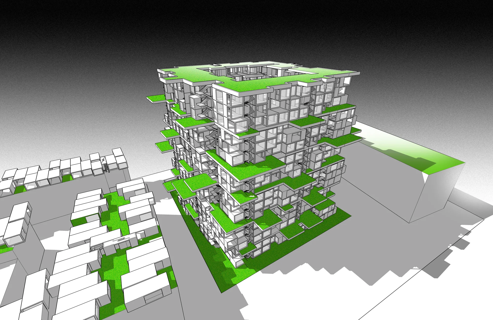 Ziel war es, neben den vorhandenen Gewerbefläche eine besondere Form der Wohnnutzung zu generieren, die, entgegen der ausschließlichen Nutzung als Wohn- oder Gewerbefläche entsprechend des Flächennutzungsplanes die organisatorische Verschmelzung von Wohnen und Arbeiten zum Ziel hat. Es entstand so eine besondere Form der Grundrissorganisation, die über die tragende Struktur der Sanitärkerne eine horizontale und vertikale Verbindung von Grundrisseinheiten erlaubt. So ist es möglich Wohnungen bzw. Gewerbeflächen zwischen 30 und 700qm herzustellen. Die Vorteile des Bauherrn liegen somit bei der nachhaltigen und flexiblen Auslegung der Grundrisse und einer damit verbundenen weiten Varianz im Mieterspektrum.