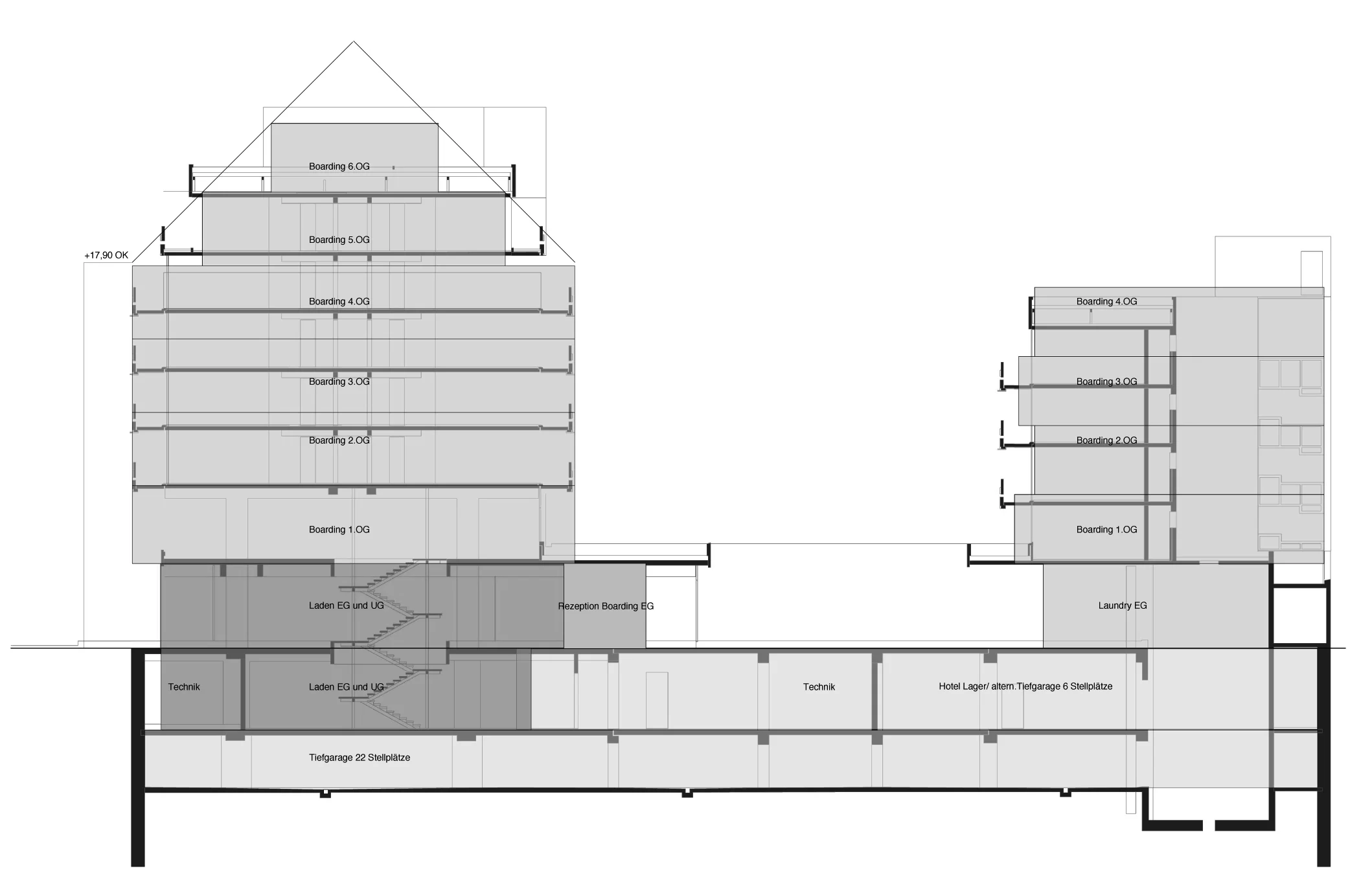 Das Vordergebäude mit acht oberirdischen Geschossen zur Hohenzollernstraße, ein Hofgebäude und ein Rückgebäude. Im Hauptgebäude wird, neben der Ladennutzung im Erdgeschoss, ein Hotel mit 82 Zimmern entstehen. Im zweiten Untergeschoss