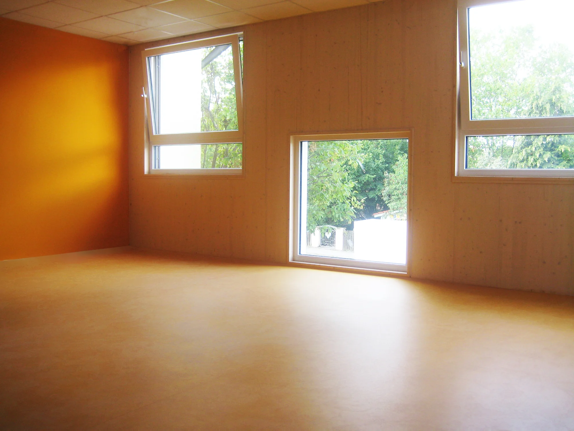 Bei der Gestaltung der Fassade wurde darauf geachtet ein für die Kinder, gerade von Innen interessantes und erlebbares Fassadenkonzept zu entwickeln. Der Altersstufe gerecht werdend, wurden die Fenster auf unterschiedlichen Höhen positioniert, sodass es den Kindern möglich ist Ausblicke auf die Straße und den Garten zu erhalten.