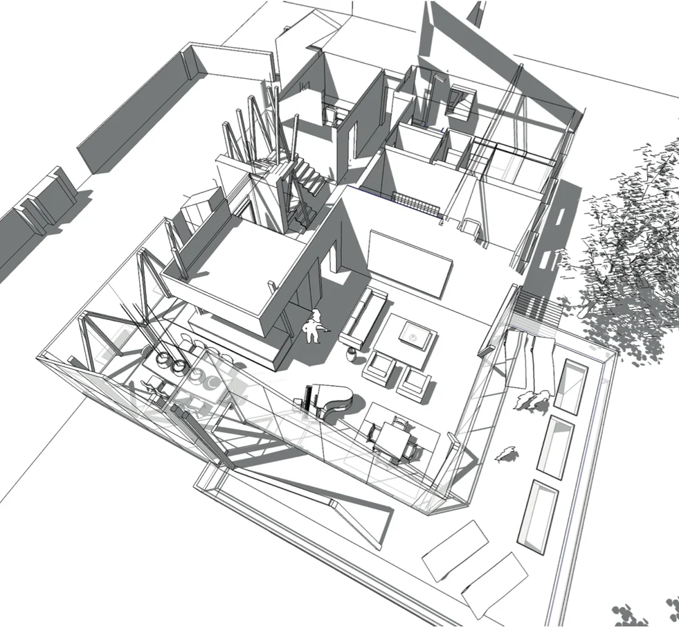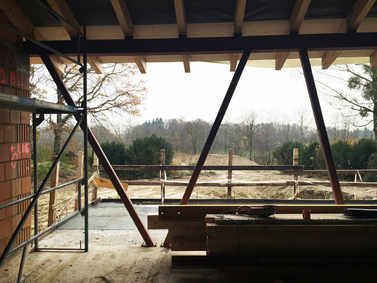Die Besonderheit bei vorliegendem Entwurf liegt darin, dass das Fachwerk in filigranen Stahlträgern, und die Holzverkleidung in Glas ausgeführt wird. Es ergibt sich somit ein zweigeschossiger Anbau, der das Wohn- und Esszimmer, sowie die Küche beinhaltet. Trotz der großflächigen Verglasung auch nach Norden stellt das Bauvorhaben einen besonderen Beitrag zu innovativen ökologischen Lösungsansätzen dar.