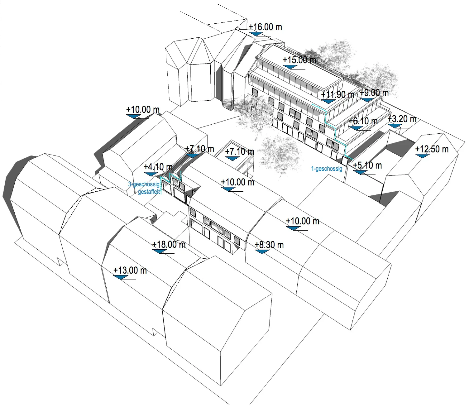 Ergebnis der Erarbeitung der Bauvoranfrage war eine baurechtlich abgesicherte, detailliert ausformulierte Gebäudekubatur, die aus den Brandwänden und baurechtlichen Gegebenheiten der umgebenden Grundstücken resultierte.