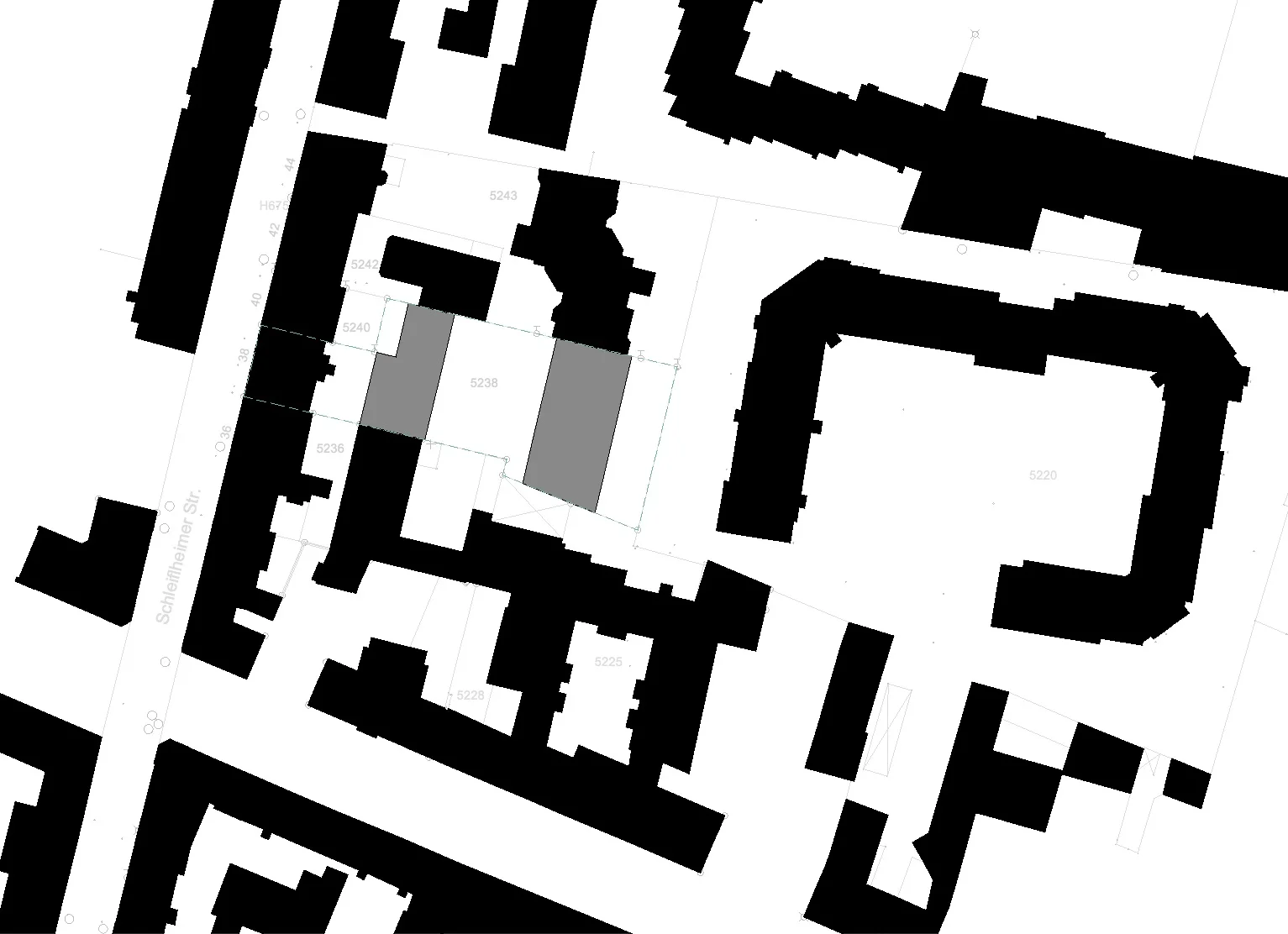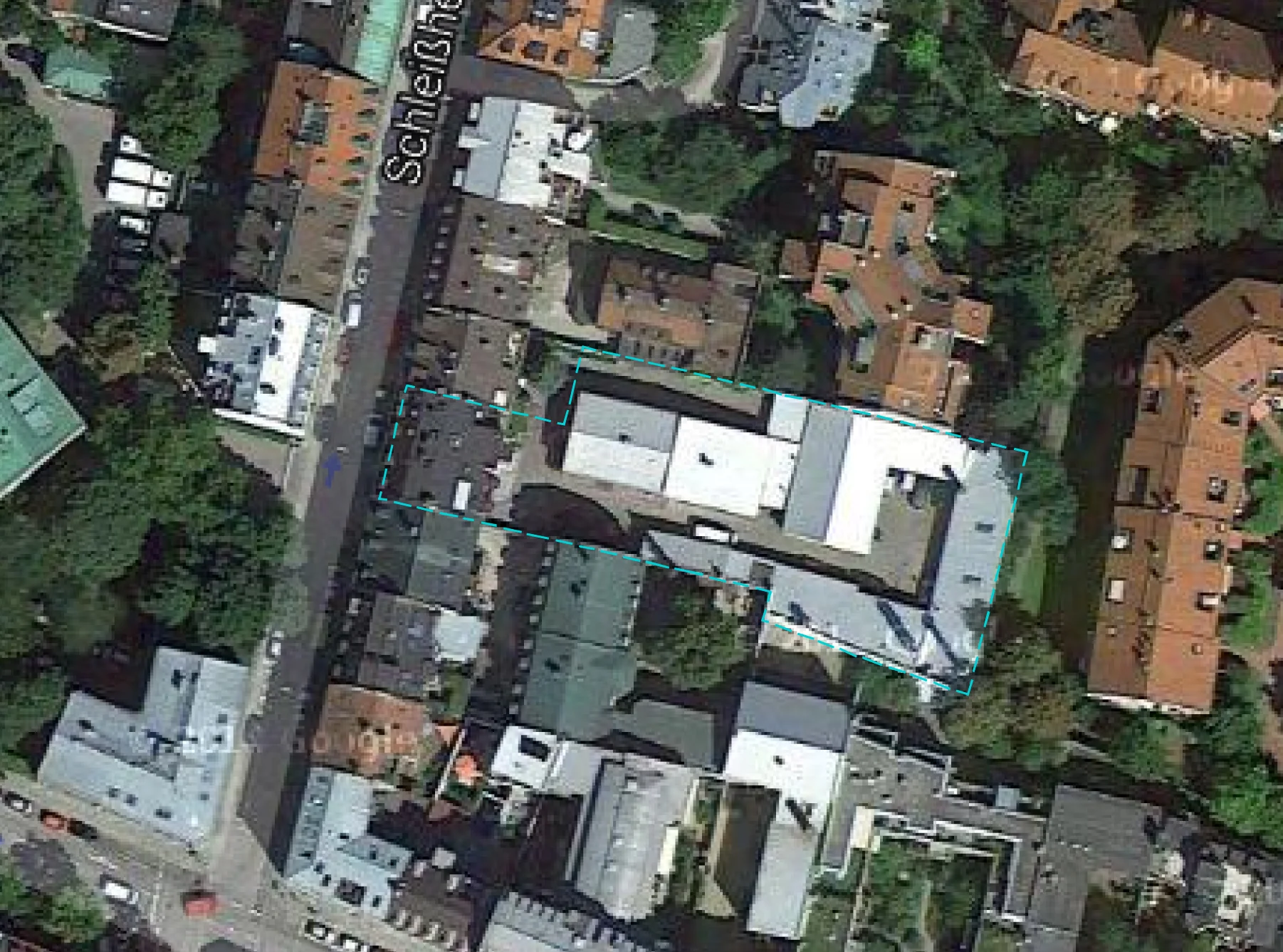 Das Anwesen in der Schleißheimer Straße 38 in München Maxvorstadt besteht aus einem Vorderhaus mit Wohnnutzung und einem Konglomerat aus Gewerbeflächen mit Werkstätten und Garagen auf einem langgestreckten Grundstück. Als Entscheidungsgrundlage für die Vertragsverhandlungen mit den Eigentümern wurden alternative Konzepte mit Volumen und Grundrissalternativen entwickelt, die das ökonomische Potential des Grundstückes zeigen sollten.