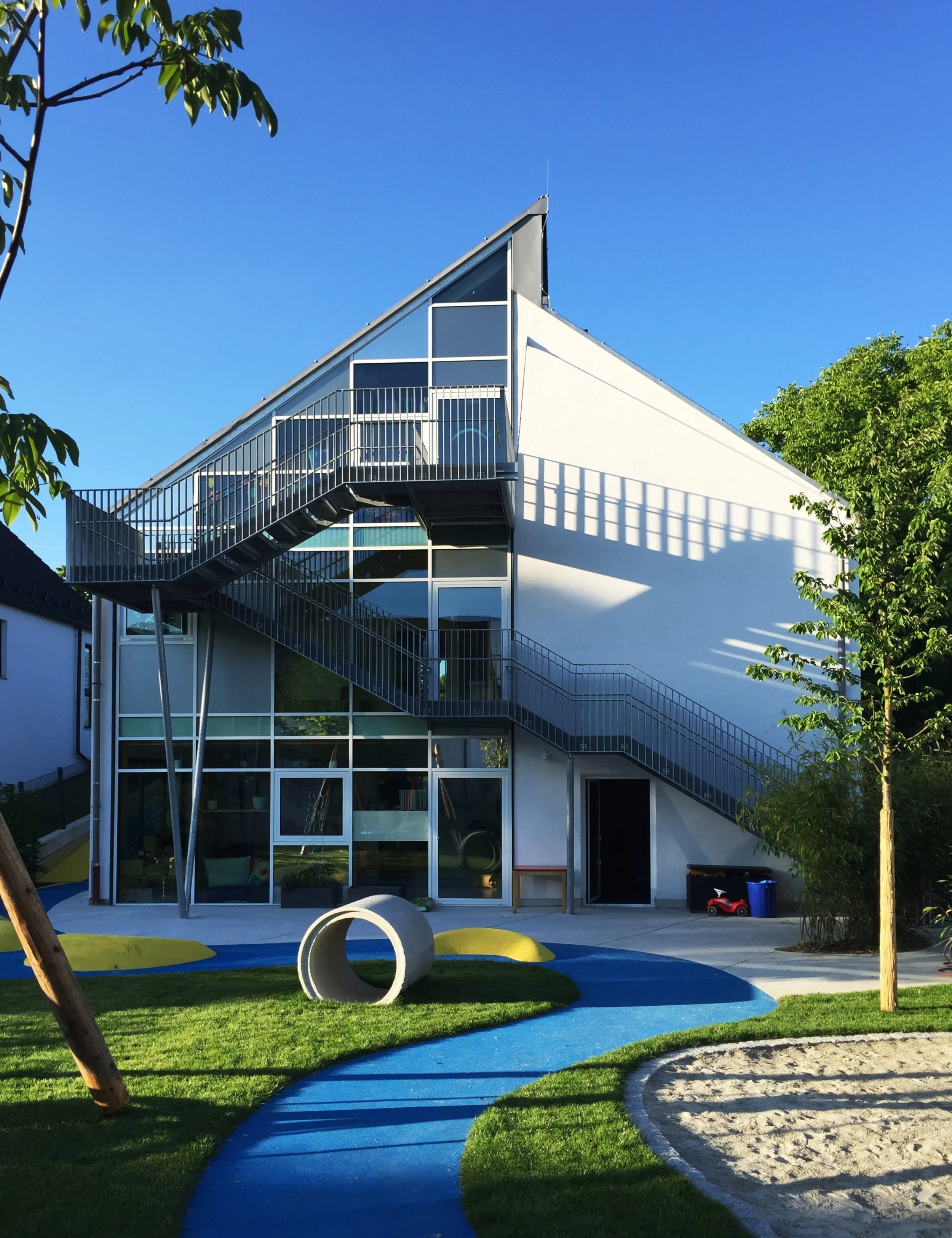 Beschreibung: Die Kindertagesstätte Milchstraße in der Wasserburger Landstraße in München Trudering ist die zweite Kita, die gemeinsam mit dem Landschaftsarchitekturbüro Hinnenthal-Schaar für den privaten Träger MDM-Kinderbetreuung GmbH realisiert werden konnte.