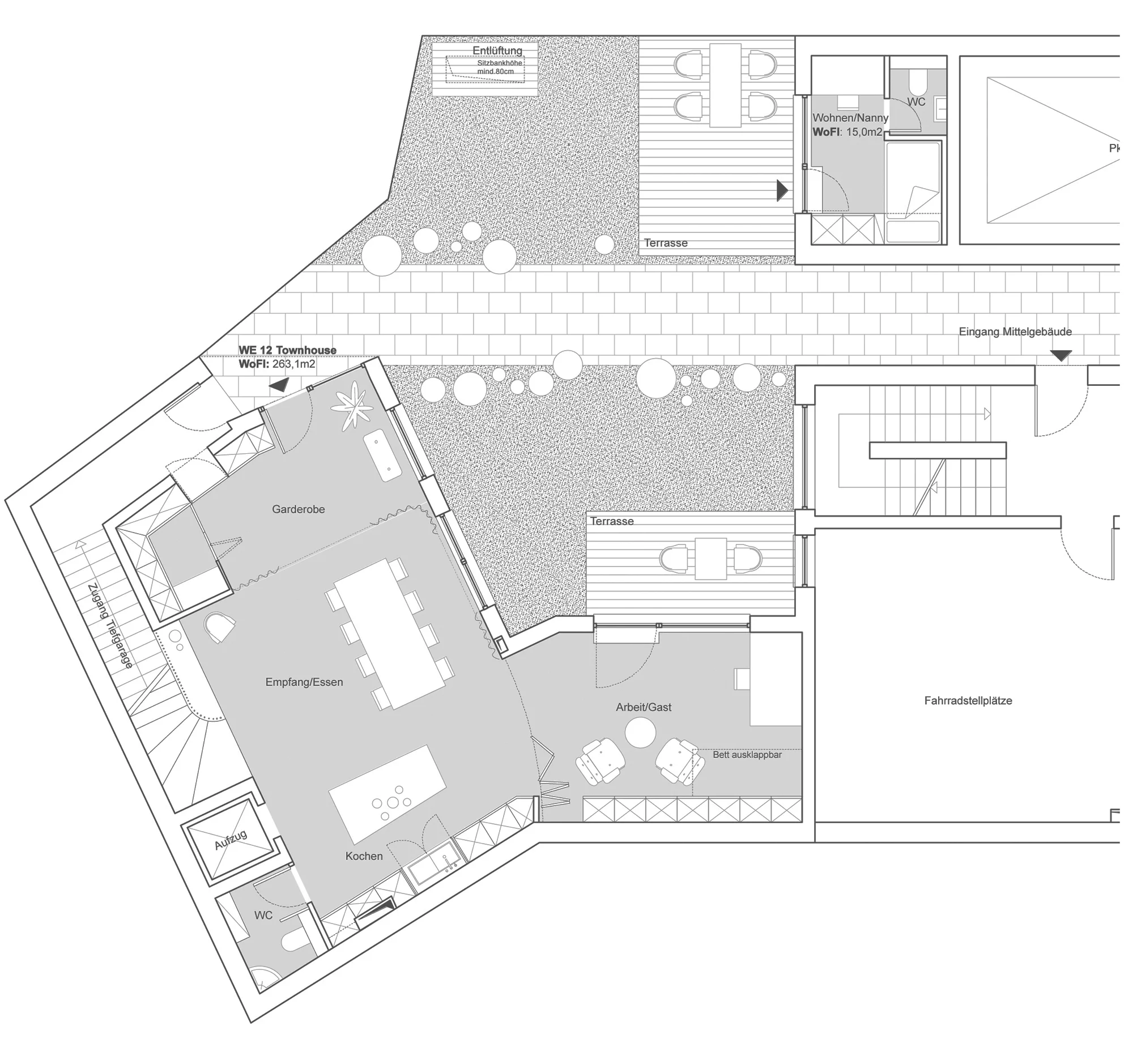 Das Stadthaus verfügt ebenfalls über einen direkten Zugang zur Tiefgarage mit den dazugehörigen Nebenräumen.