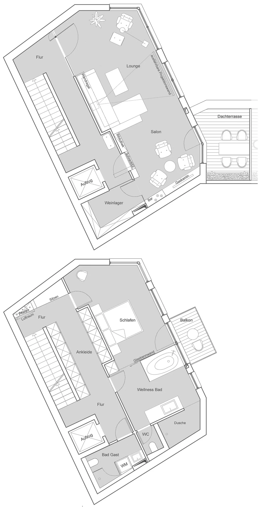 Das Stadthaus erstreckt sich über 4 Geschosse. Einem Foyergeschoss mit Büroeinheit und Nebenräumen, einem Wohngeschoss mit Esszimmer, einer Ebene mit Schlafzimmer mit Masterbad und einer Bibliothek als Adlerhorst über den Dächern von München mit einer großen Dachterrasse.