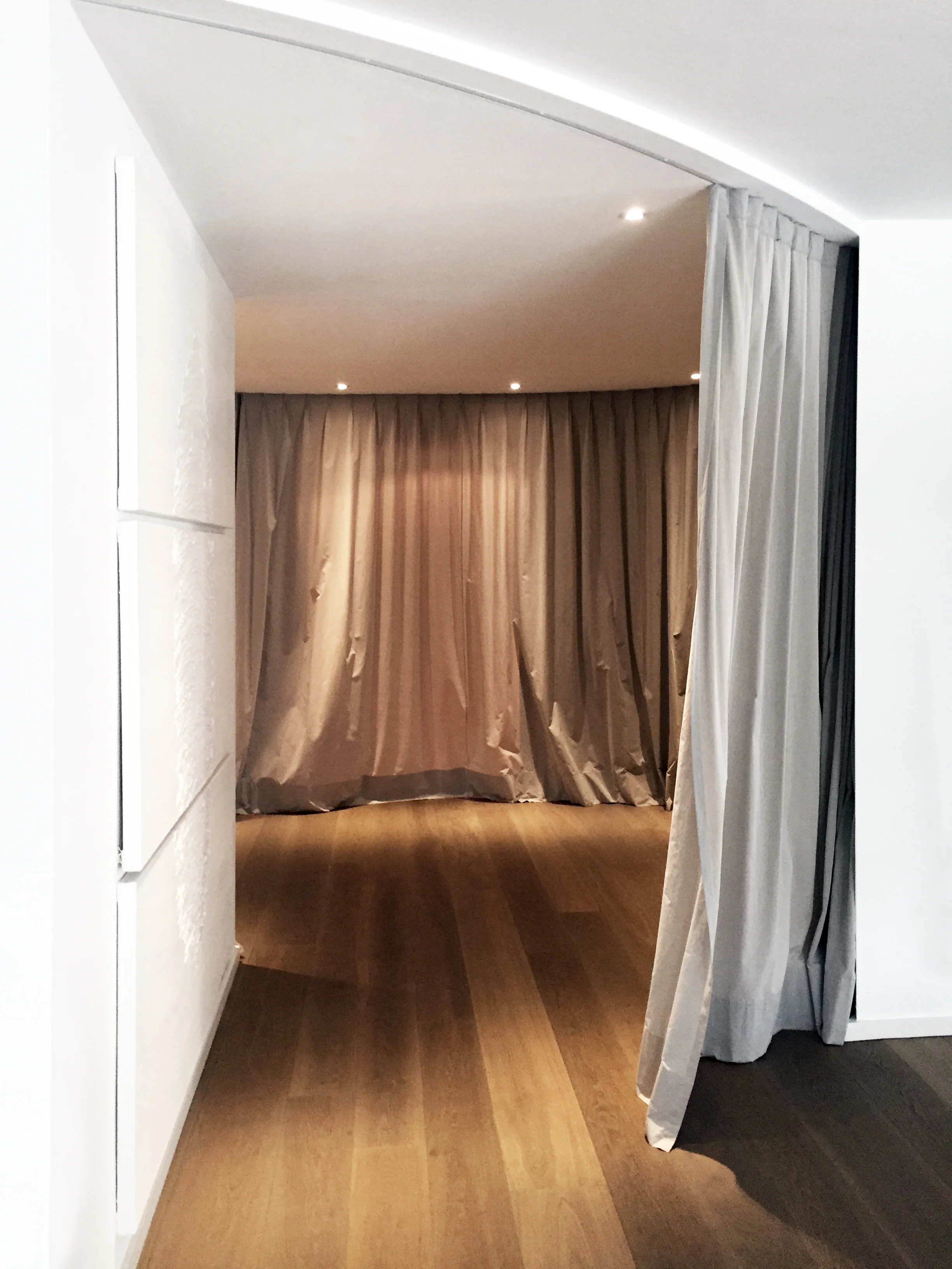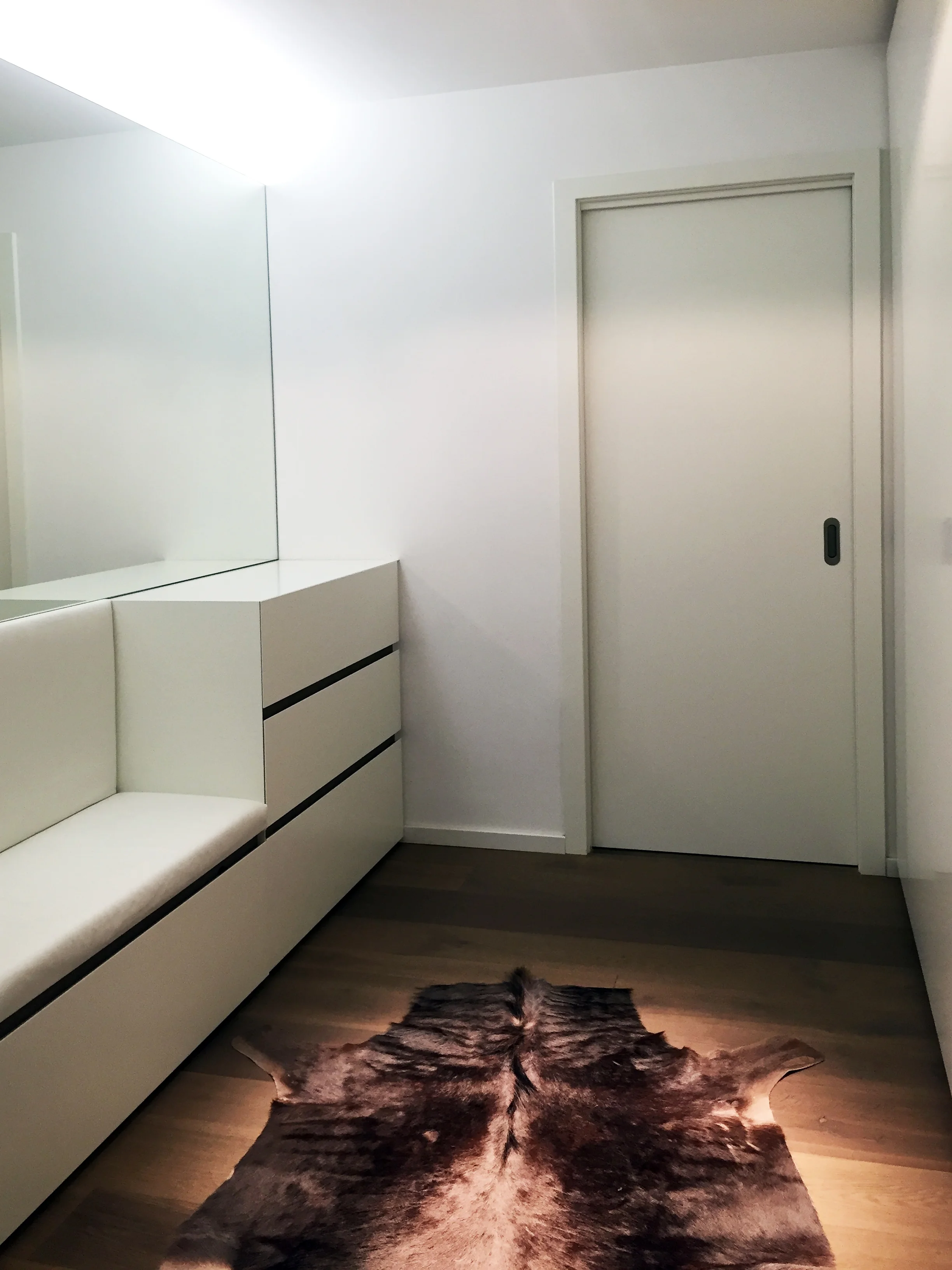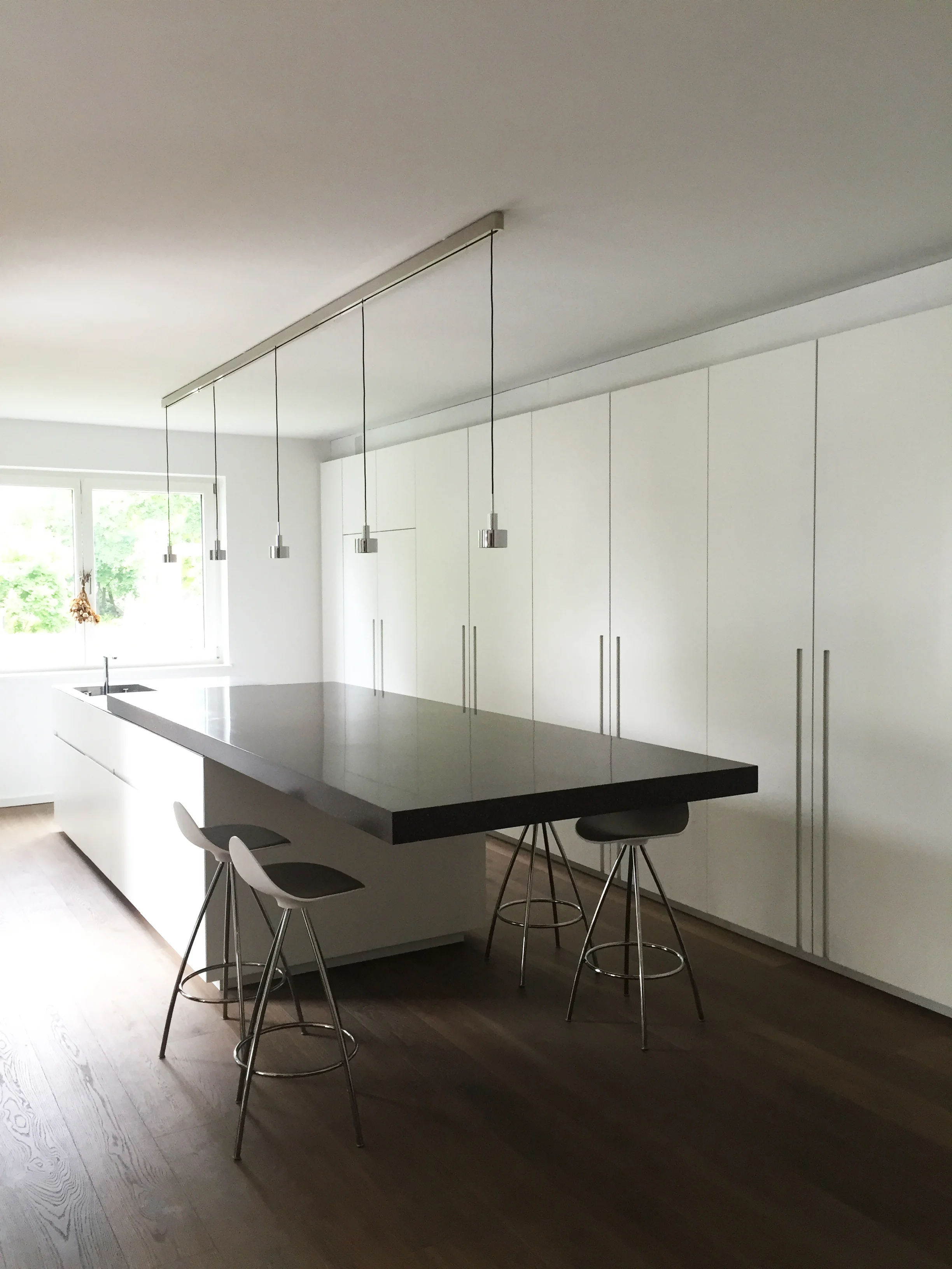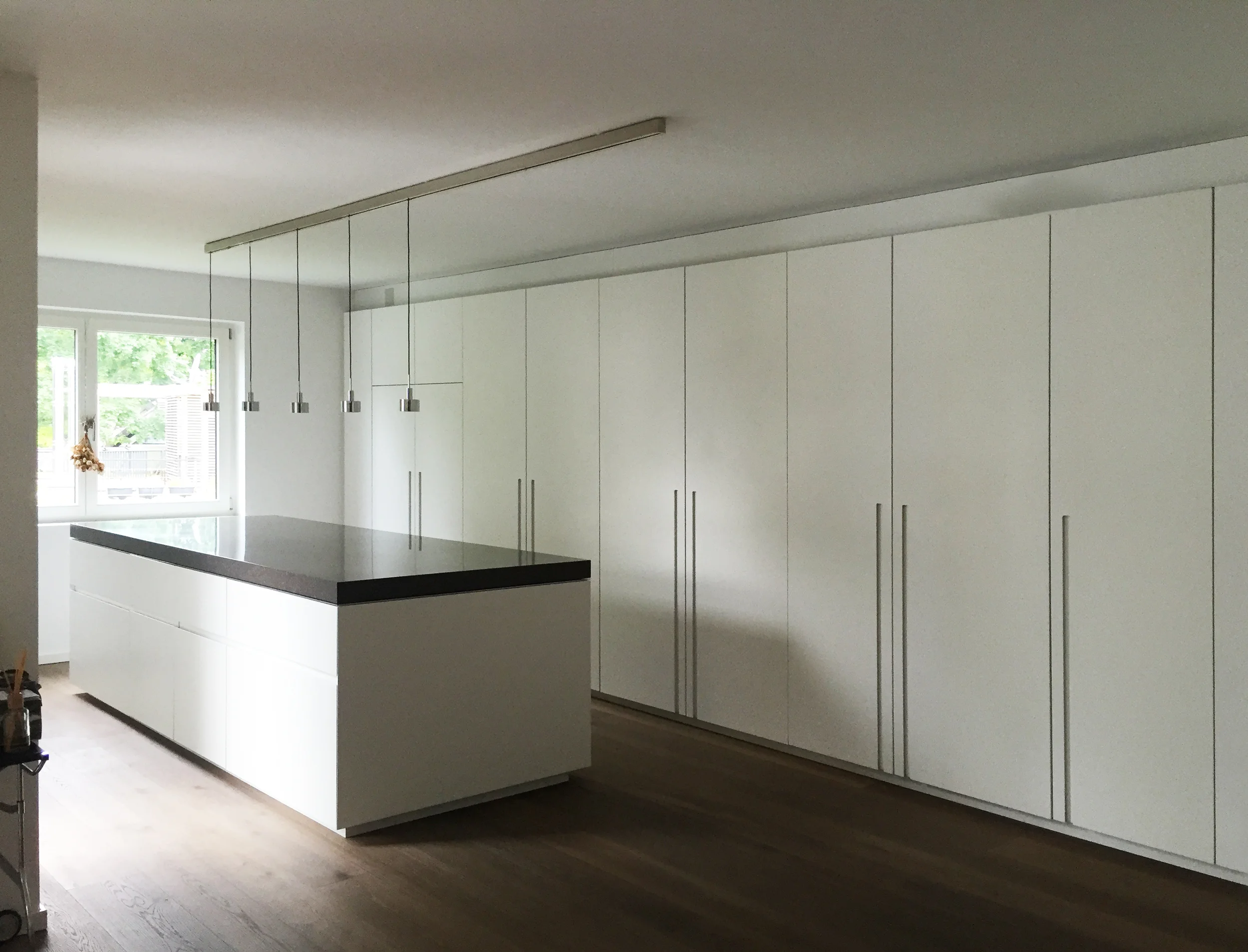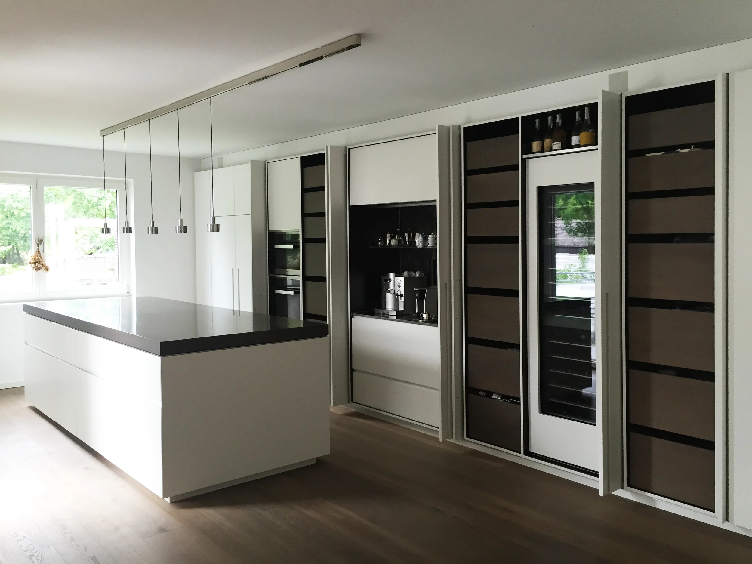 Neben der detaillierten Planung der Küche wurden folgende Bereiche geplant, detailliert und realisiert: Ankleide, Bürobereich, Schlafzimmer, Bar, Sauna, Bad und Garderobe.