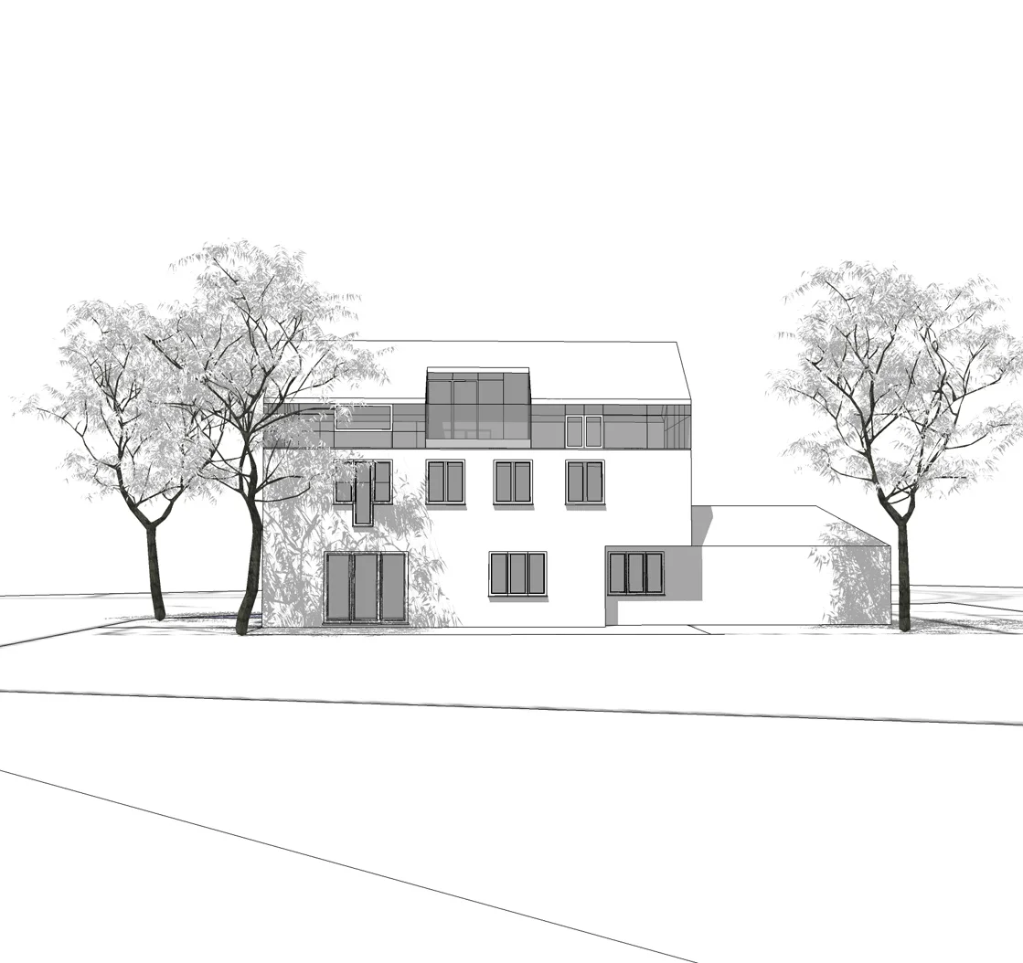 Der Entwurf der Aufstockung sieht vor, das Bestandsvolumen zu erhalten und, getrennt durch eine umlaufende Glasebene, das Dach erhöht und scheinbar schwebend über diesem Volumen anzuordnen.