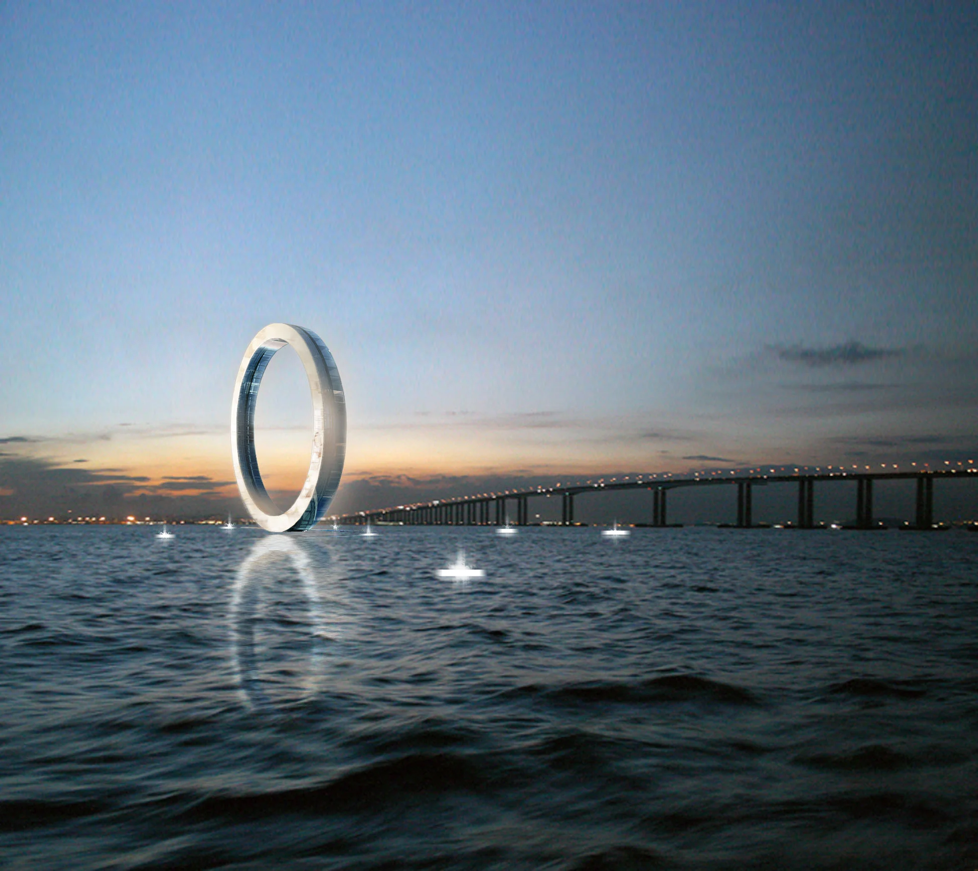 27 Floatin Stars are scattered across the entrance of the bay of Rio de Janeiro. Their specific position and size is based on the layout of the brazilian flag. These Floating Stars will not only be visible from the city and the plane, but as well on satellite photos. Each Floating Star consists of a compact ring, attached to the seabed like a buoy. The rings emit light vertically to sky, as well as horizontally above the ocean. The outside facade is made from translucent material with a board of LEDs arranged behind. To the inside, the LEDs emit light onto the settled water surface which functions as a mirror of water reflecting the light to the sky. During daytime this mirror of water reflects the sunlight, in contrast to the rippled water surface at the outside of the ring. The horizontal surface of the ring is equipped with photovoltaic cells, supplying the Floating Star with energy.