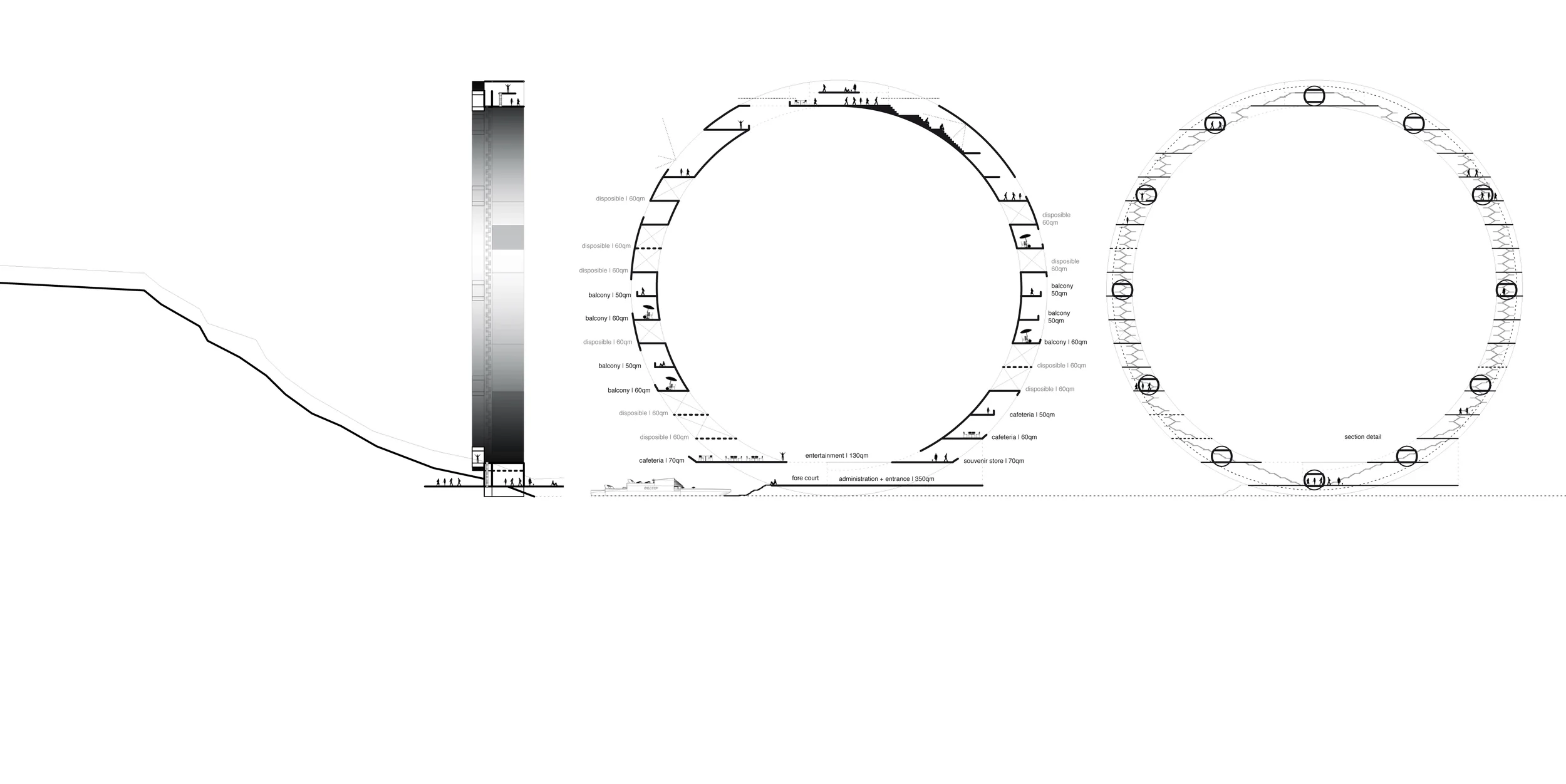 A 110m high, vertical monument will become a unique symbol at the entrance of the bay of Rio de Janeiro. Set at the boarder of Cotunduba Island, the Ring of Light is facing towards the Copacabana and Corcovado. A surface of sunlight-reflecting fabric is covering the whole ring structure, allowing an unobstructed view from the inside. At night thousands of LEDs, arranged behind the fabric, illuminate the Ring of Light. The uniqueness of the tower will be it´s present and future configuration of a variety of functions, stacked all around the 360° of the Ring of Light. Depending on their specific requirements, these functions are organised either at the bottom, the side or the top of the ring. The Ring of Light is thereby divided into levels of functions and sections of organisation. Next to the section of functions, the general circulation is organised by a rotating ring, containing 12 wagons. Depending on the allowed accessibility, the visitor can either take a ride around the ring and enjoy the amazing vista, access for example one of the urban balconies, or visit the observation decks. These 12 wagons allow a high amount of visitors at once and an elaborated accessibility to the different functions in the ring. Between the sections of organisation mentioned above, the internal and emergency circulation is arranged. In addition, the tower allows further functions to be implemented in its steel-structure. In a later stage, when the application for and a possible organisation of the Olympic Games in 2016 is proceeded, national or international organisations, as well as private companies might buy private lounges in the tower.