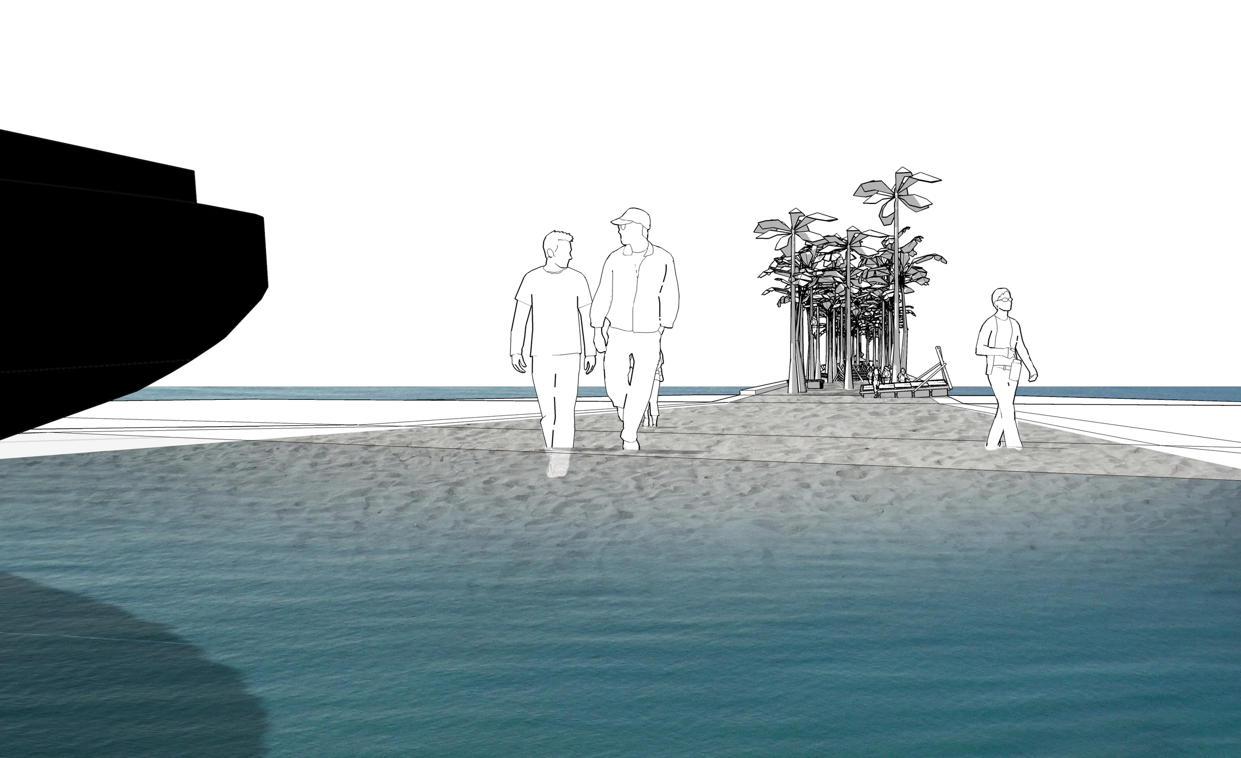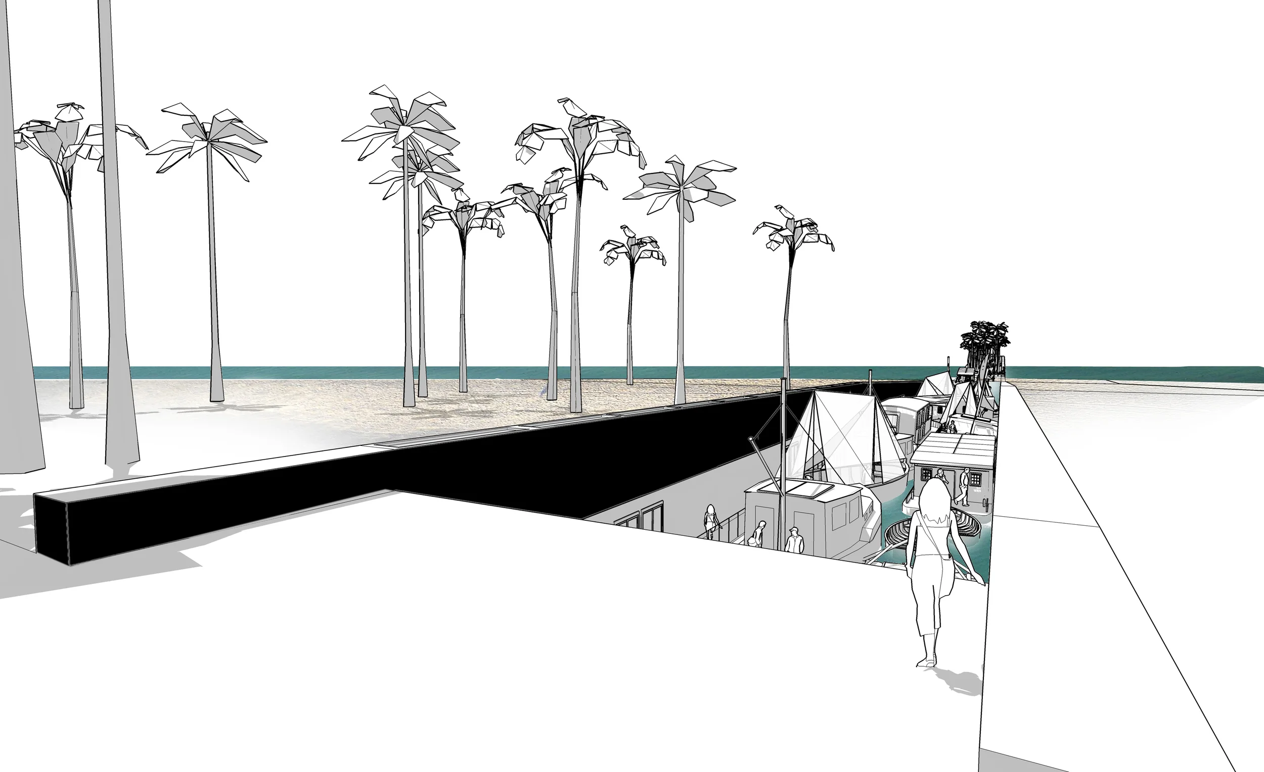 From Coast to Coast, the new architectural landmark for the immigrants in Miami Beach, shall be understood as a unique horizontal monument regarding the paradisiacal and the cosmopolitan of the South Beach of Miami. In memory of those who left family and home searching for their own American Dream, the monument shall represent the meeting from opposites, from leaving and arriving, from loneliness and multiculturalism, from fear and hope. The antagonism of circumstances and feelings comes along with the first step in direction of the unknown. From Coast to Coast consists of an horizontal stripe which gives form to this contradiction in real time and space. Bringing the „extremes“ together, intentional allegorized through the inversion of ocean and sand, the museum illustrates the antagonism which the immigrant is confronted with and invites the visitor to experience it. As soon as the visitor reaches the museum, he must leave the „mainland“, the busy cityscape, to get into the exhibition: descending to the level of the monument, the visitor is surrounded by all kinds of old ships and boats constrained into the narrow and seemingly infinite channel of the monument. Passing through the „Boat-Entrance-Hall“, the visitor can walk from boat to boat, where the temporary and the permanent exhibitions are organized. The boats are attached to the artificial seabed of the channel like a buoy. Between the exhibition boats, the „Boat-Cafeteria“ is located. At the end of the exhibition, the visitor is confronted with the seemingly insuperable artificial expanse of water, extending to the new shoreline. To leave the exhibition area, the visitor must now take a boat which brings him to the desired shore. At the end of the pier the visitor is confronted again with the infinite expanse of water, the ocean, taking chance to contemplate the horizon in memory of those who came from the other coast.