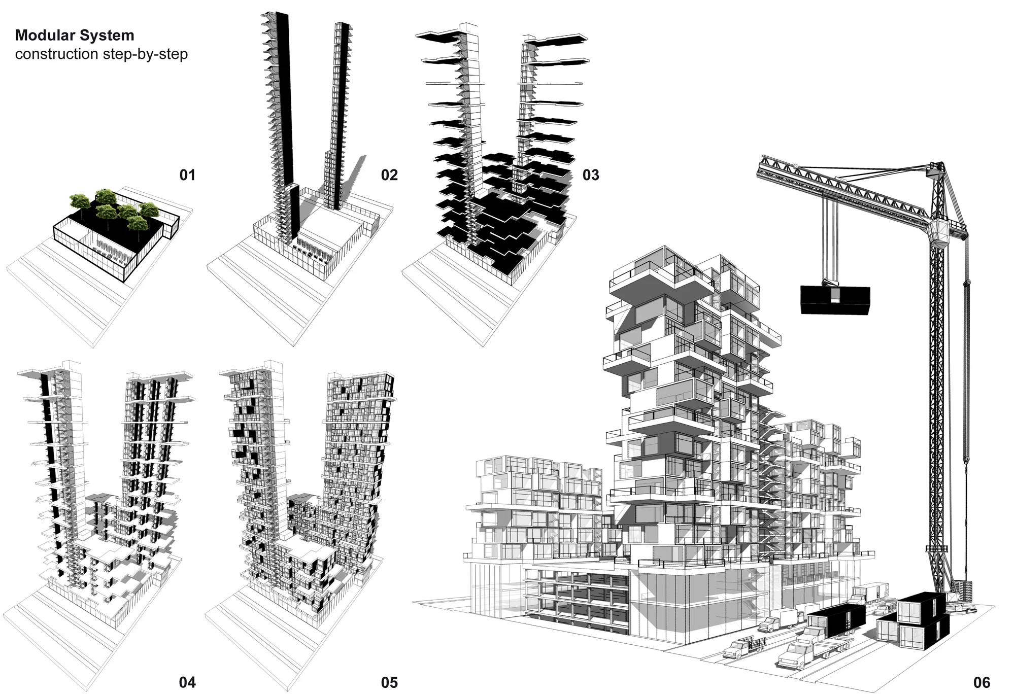 The buildings are mainly constructed with prefabricated parts; just the pavements should be adapted for each building. In addition to the variable pavements (03), the structure is sustained by elements of reinforced concrete, all of them modular: the “box” of the main staircases and lifts (02), the sanitary cores (where all the pipes are placed) and secondary stairs (which connect rooms inside the same dwelling / 04). The pavements are placed each 3 floors (10 meters / 03), and serve as base for overlapping the modules (05). The modules placed on and between the pavements are also prefabricated elements. The modules arrive “almost done”: with flooring, tiles, finishing and electrical installations. The advantages of this construction principle are enormous, such as more quality control, saving in maintenance and transport of materials, in addition to the high speed that the buildings can be constructed as a huge puzzle of modular pieces. Due to the selected dimensions, the structural elements as well as the modules of dwellings can be transported on trucks and erected by cranes (06).