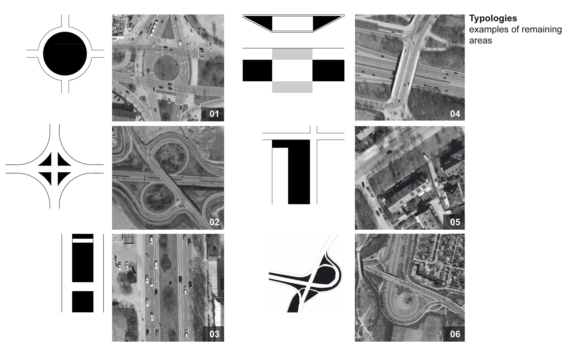Including any type of traffic islands, track sections, unused areas under bridges, distance space between living and traffic as well as all not used (or rather bad used) areas surrounding the road, rail and public local traffic. One inner-town left over space results from the intention of separating streets, giving some green to a grey road space or even slowing down the traffic. Frequently they are just remaining areas, which came into being through the connection of several roads of a transport hub and intersections.