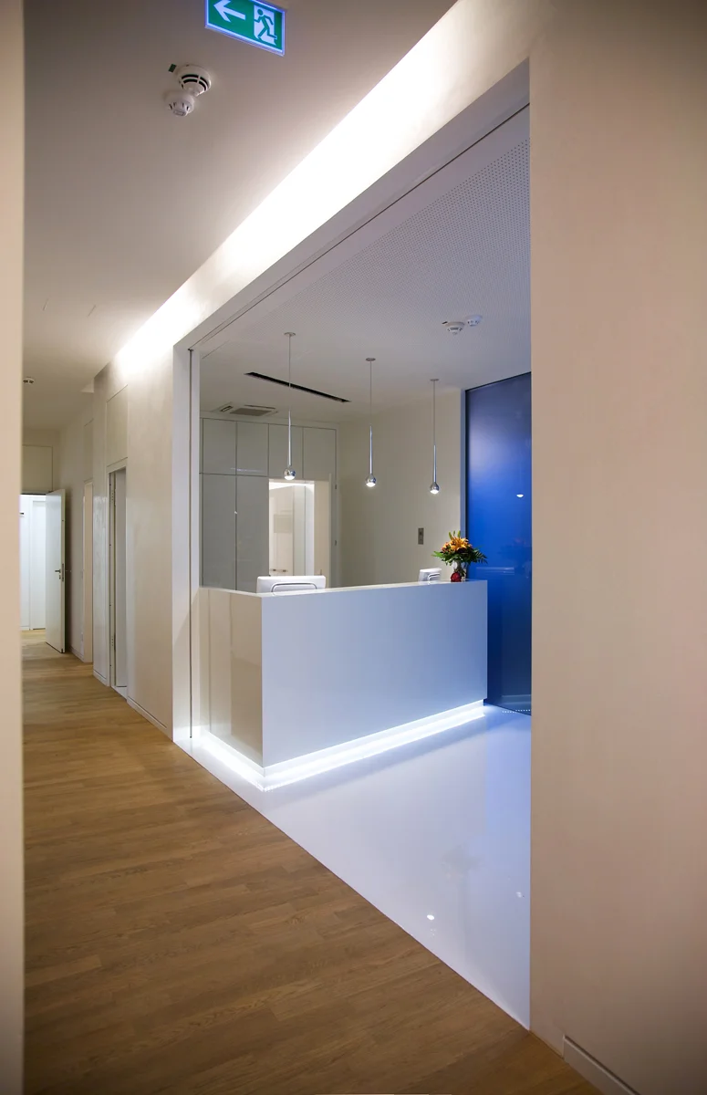 Die Wahl eines geeigneten Bodenbelages für eine Zahnarztpraxis stellt eine große Herausforderung dar, insbesondere wenn ein durchgängiger Belag in allen Räumen gewünscht wird. Kaum ein Bodenbelag erfüllt in gleichem Maße die ästhetischen, hygienischen, bautechnischen, ökologischen und ökonomischen Anforderungen. Eine die Behandlungsräume begrenzende transluzente Glaswand schafft Intimität und gleichzeitig Offenheit für die Patienten, belichtet das Foyer mit Tageslicht und erlaubt von Außen zu beurteilen, ob der Raum besetzt ist oder nicht. Das so entstehende Spiel mit unterschiedlichen Glanz-, Farb-, Haptik-, und Transparenzeffekten einer Oberfläche ähnelt in vielen Punkten dem höchst sensiblen An- und Einpassungsprozess eines neuen Zahnes in die direkte und indirekte Umgebung im Mundraum. So ist in diesem Projekt Architektur und Zahnmedizin zu einer unzertrennlichen Einheit zusammengeführt worden. Die beiden Organismen bedingen sich wechselseitig und kommen ohneeinander nicht aus.