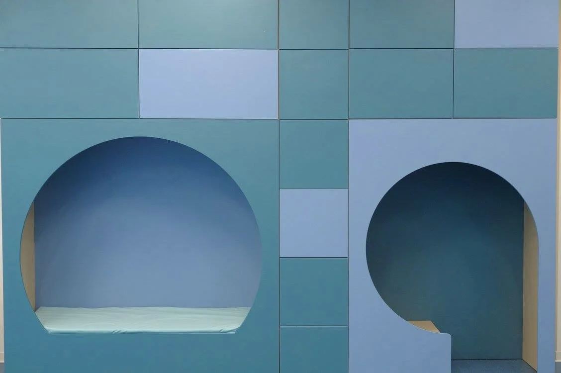die Gruppenräume wurden orange, die Schlafräume petrol, der Mehrzweckraum blau, der Flur hellgrün und die Verwaltungs- und Personalräume rot angelegt. Dieses Farbschema wurde am Boden, an den Wänden und auch bei den Leuchten angewandt.