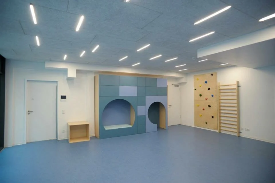 Die Herausforderung bestand darin, eine kindergerechte und abwechslungsreiche Umgebung für die unterschiedlichsten Nutzungen innerhalb einer Kindertageseinrichtung in einem sehr langen und