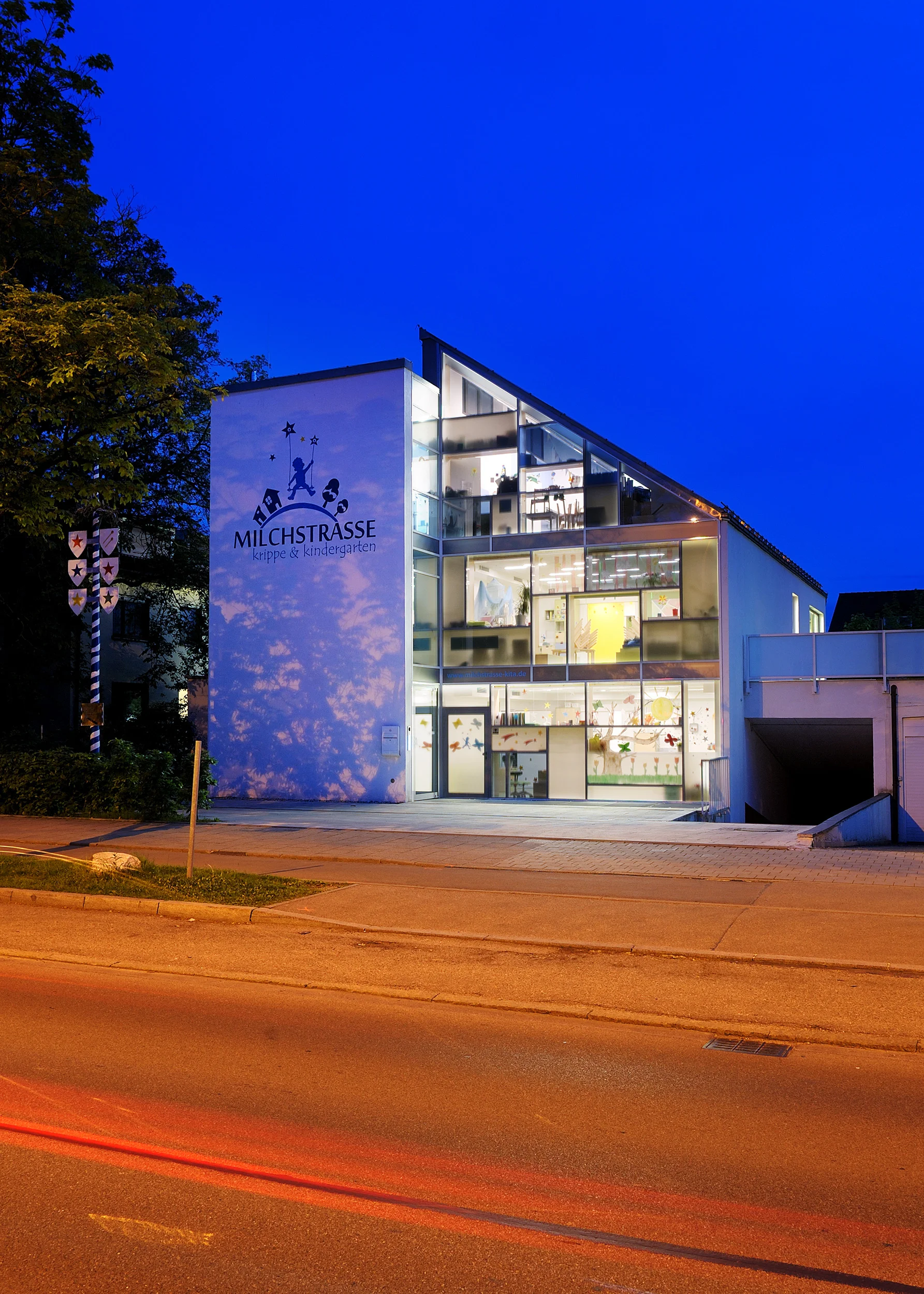 Die Kindertagesstätte Milchstraße in der Wasserburger Landstraße in München Trudering ist die zweite Kita, die gemeinsam mit dem Landschaftsarchitekturbüro Hinnenthal-Schaar für den privaten Träger MDM-Kinderbetreuung GmbH realisiert werden konnte.