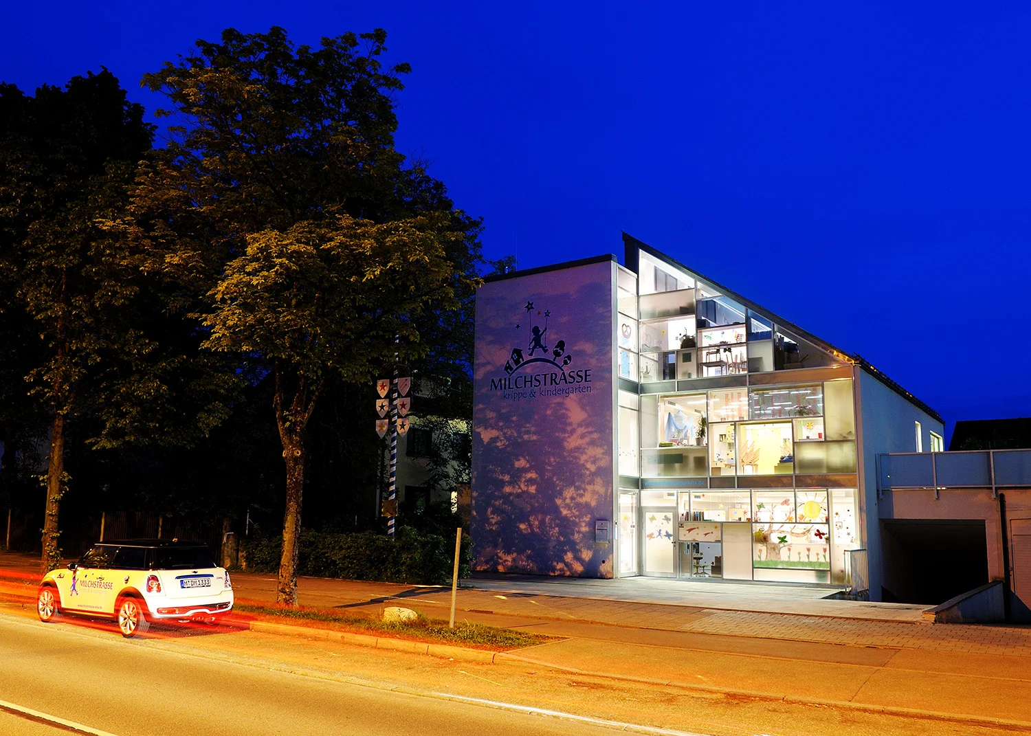 In der Gelbhofstraße 6 in München Hadern wurde in Juli 2014 die erste Milchstraße Kindertagesstätte eröffnet. Dazu wurde ein alter monolithischer Baukörper einer Bank umgenutzt, aufgestockt und saniert.