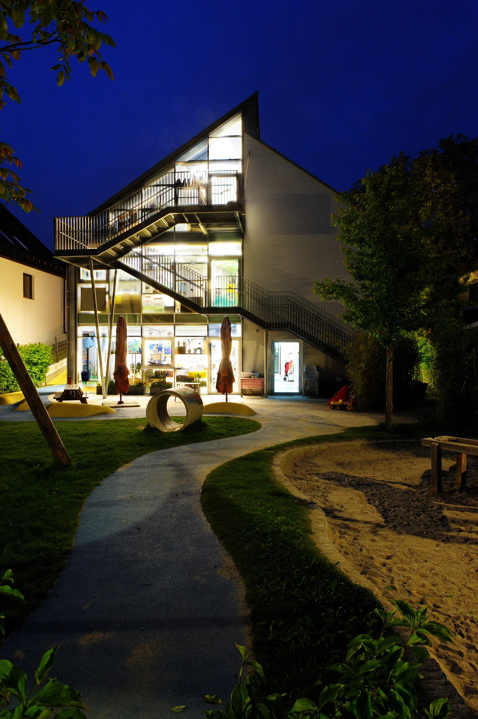 In einem ehemaligen Autohaus konnten vier Betreuungsgruppen über 4 Ebenen realisiert werden. Im Souterrain befindet sich ein großer Mehrzweckraum, die Küche, Nebenräume und eine Tiefgarage für die Mitarbeiter der Kindertagesstätte.