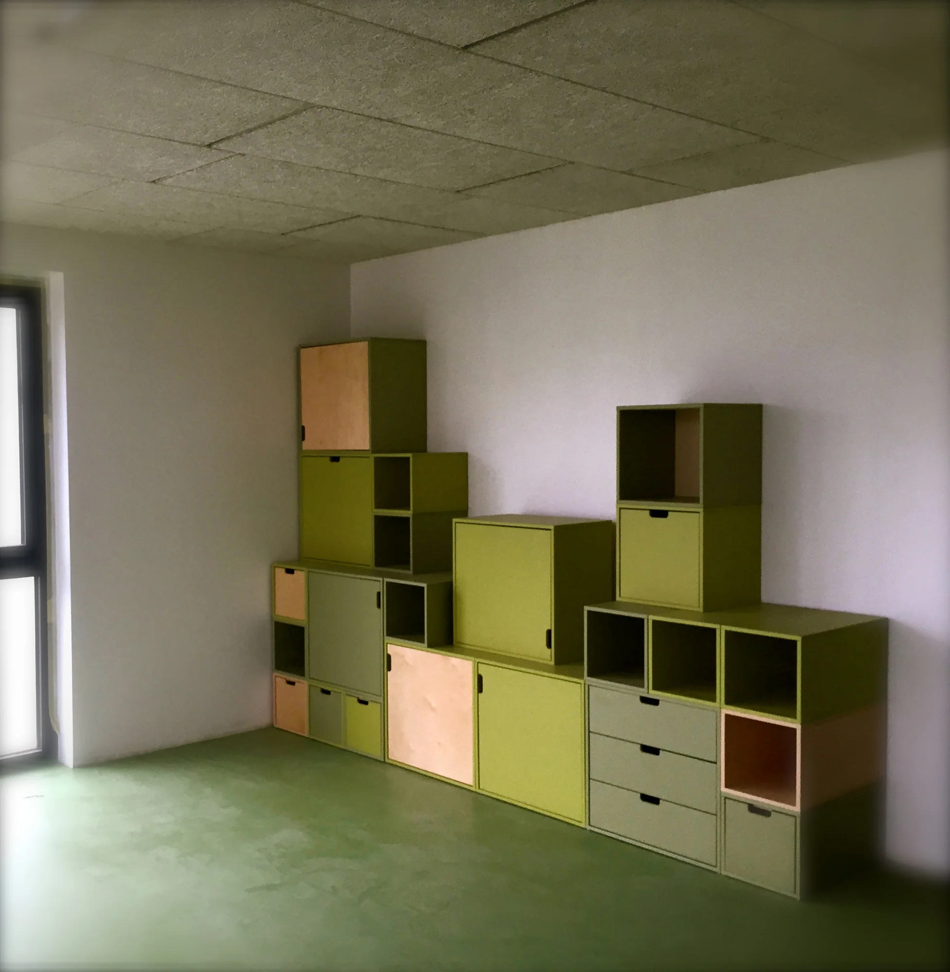 Ein besonderes Augenmerk wurde auf die Entwicklung eines eigenständigen Möbelkonzeptes gelegt, dass auch in den weiteren, sich in Planung befindlichen Kindertageseinrichtung des Trägers, Verwendung finden soll. Das Möbelkonzept basiert auf drei, in der Größe differenzierten kubischen Grundmodulen, die je nach Position und Zusatzelement zu Schränken, Kisten, Stühlen, Regalen, Garderoben, Kletterwänden, Tischen umgebaut werden können.