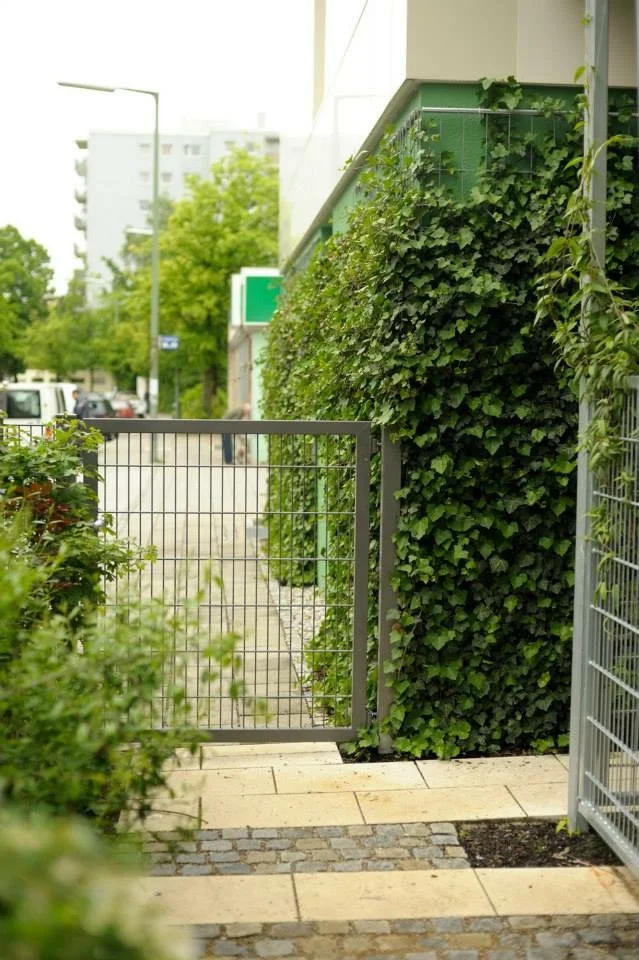 Die Fassadengestaltung gliedert den Baukörper horizontal in zwei Ebenen. Einem begrünten Sockel, der den Bezug zum Garten und dem umliegenden Park herstellt, und einem darüber schwebenden Monolith, der mit einem verspielten Muster in den Metallpaneelen gegliedert ist. Im Sockelbereich ist dem neuen Wärmedämmverbundsystem ein Rankgerüst vorgesetzt worden, an dem im Straßenbereich Efeu, und im Hofbereich Geißblatt emporwächst.