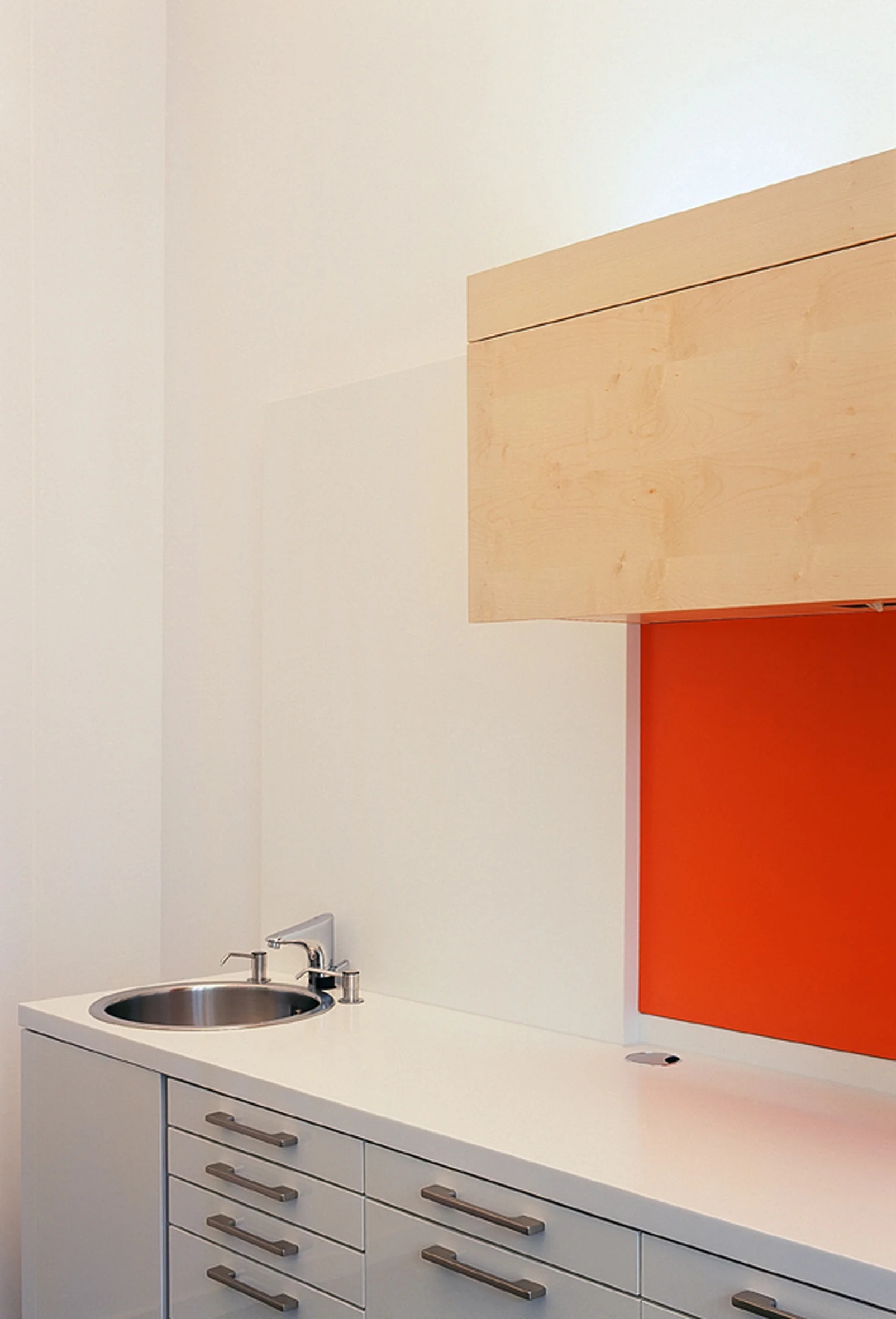 Herausforderung bei der Zahnarztpraxis Goldmann am Marienplatz 17 war auf geringstem Raumangebot (50 m²) maximale Funktionalität und Flexibilität zu erreichen. So musste jede sich bietende Lücke und Nische durch „architektonische Implantate" gefüllt werden. „Architektonische Brücken" halten diese Implantate zusammen und schaffen ein architektonisches Gesamtkonzept. Was sind also architektonische Implantate, was sind architektonische Brücken? Implantate sind einzelne Möbel-stücke, die speziell für den spezifischen Raum und auch nur für diesen Raum konzipiert sind, folglich genau in die vorgegebene Form oder Hülle passen. Brücken hingegen sind Möbelelemente die ein Implantat mit dem Anderen verbinden und zu einer unzertrennlichen Einheit verschmelzen. Das Implantat kann in seiner Einzigartigkeit zwar für sich betrachtet werden und muss in seiner Funktion für sich bestehen, dennoch lenken die Brücken den Blick auf das Gesamte. So verbinden sich Designkonzept mit Praxiskonzept.