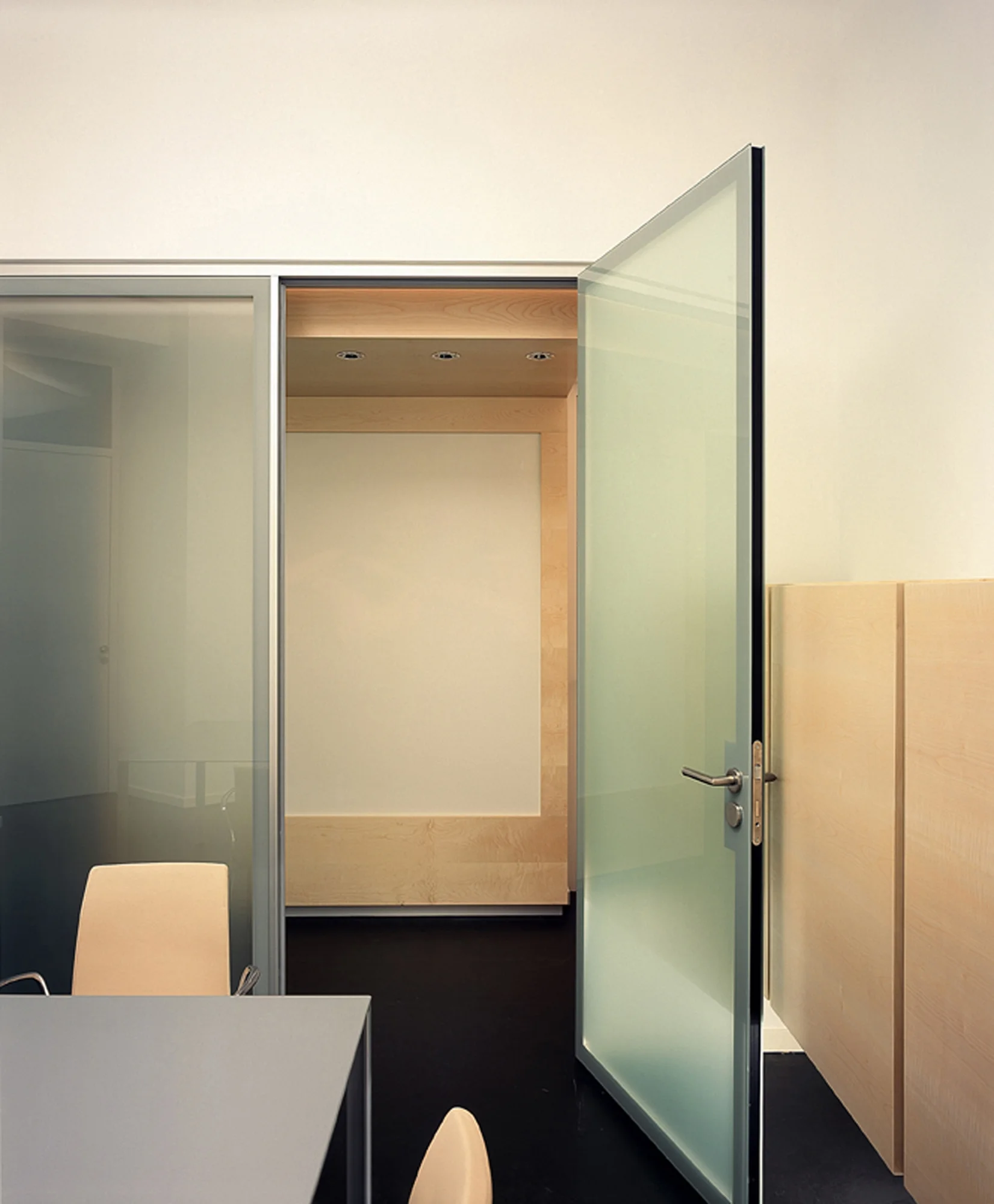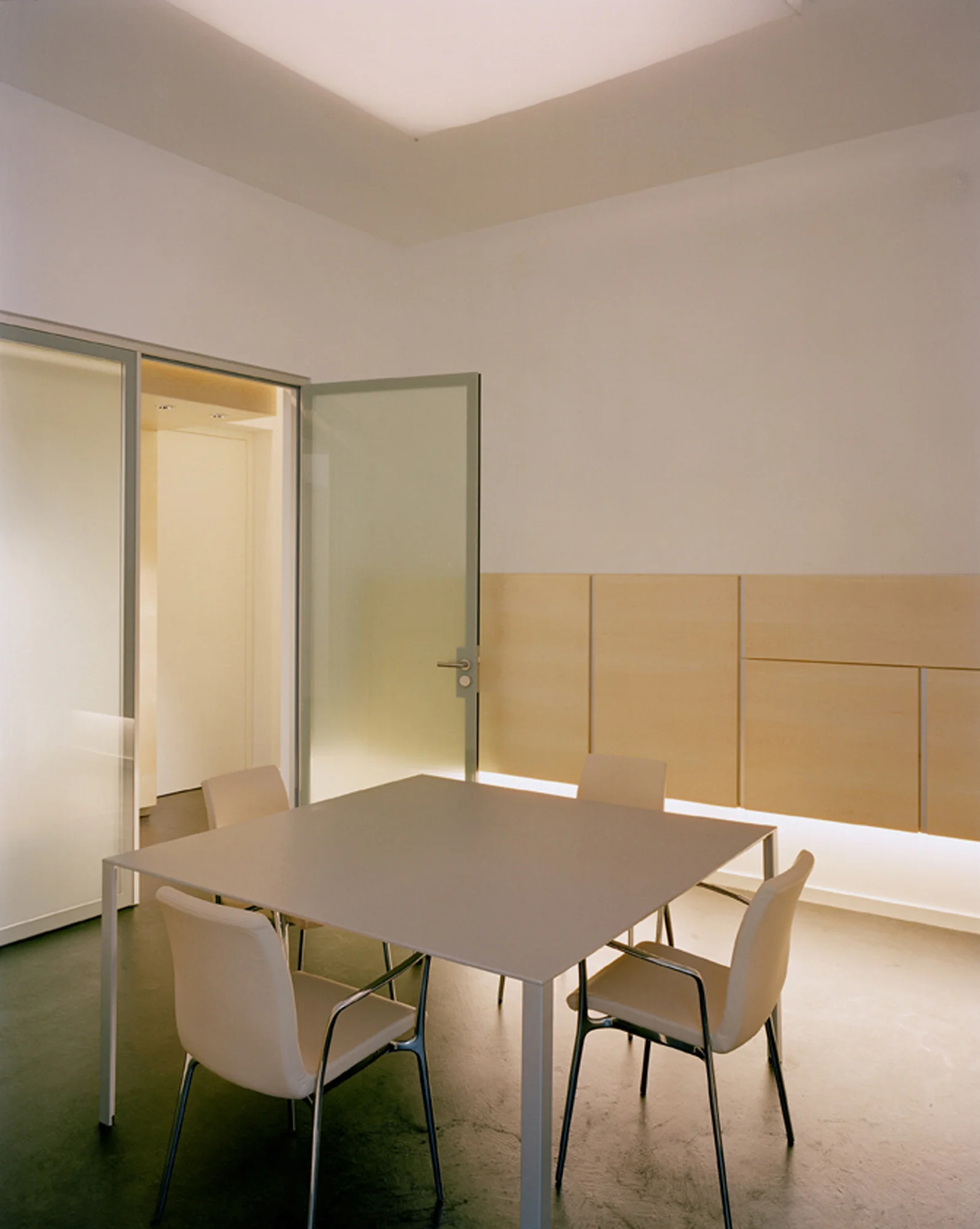 Bei der Zahnarztpraxis Dr. Denninger & Schmich war vom Anfang an das Bestreben, die Architektur mit der Zahnmedizin in eine symbiotische Beziehung zu setzen. Symbiose im Technisch / Funktionalen, sowie Symbiose im Materiellen wie Ästhetischen. Der klar gegliederte Grundriss ist genau auf die Funktionsabläufe des Arztbetriebes abgestimmt. Eine eindeutige räumliche Zonierung zwischen Öffentlichkeit / Patientenbereich und Privatem Arztinternen Betrieb erlauben einen professionellen und zeitgemäßen Praxisbetrieb und Diskretion für den Einzelnen. Die Wahl des schwarzen Gussasphaltestrichs mit matter Oberfläche reflektiert den Wunsch nach Werkstattatmosphäre und steht im spannungsvollen Kontrast zu den sonst sehr edlen Oberflächen: Europäischer Ahorn und weißer Klavierlack für die Möbel der Arztpraxis, Aluminium für den Zahntechnischen Bereich, weißer Korean für die medizinischen Arbeitsflächen, und beiges Leder für die Polsterflächen.