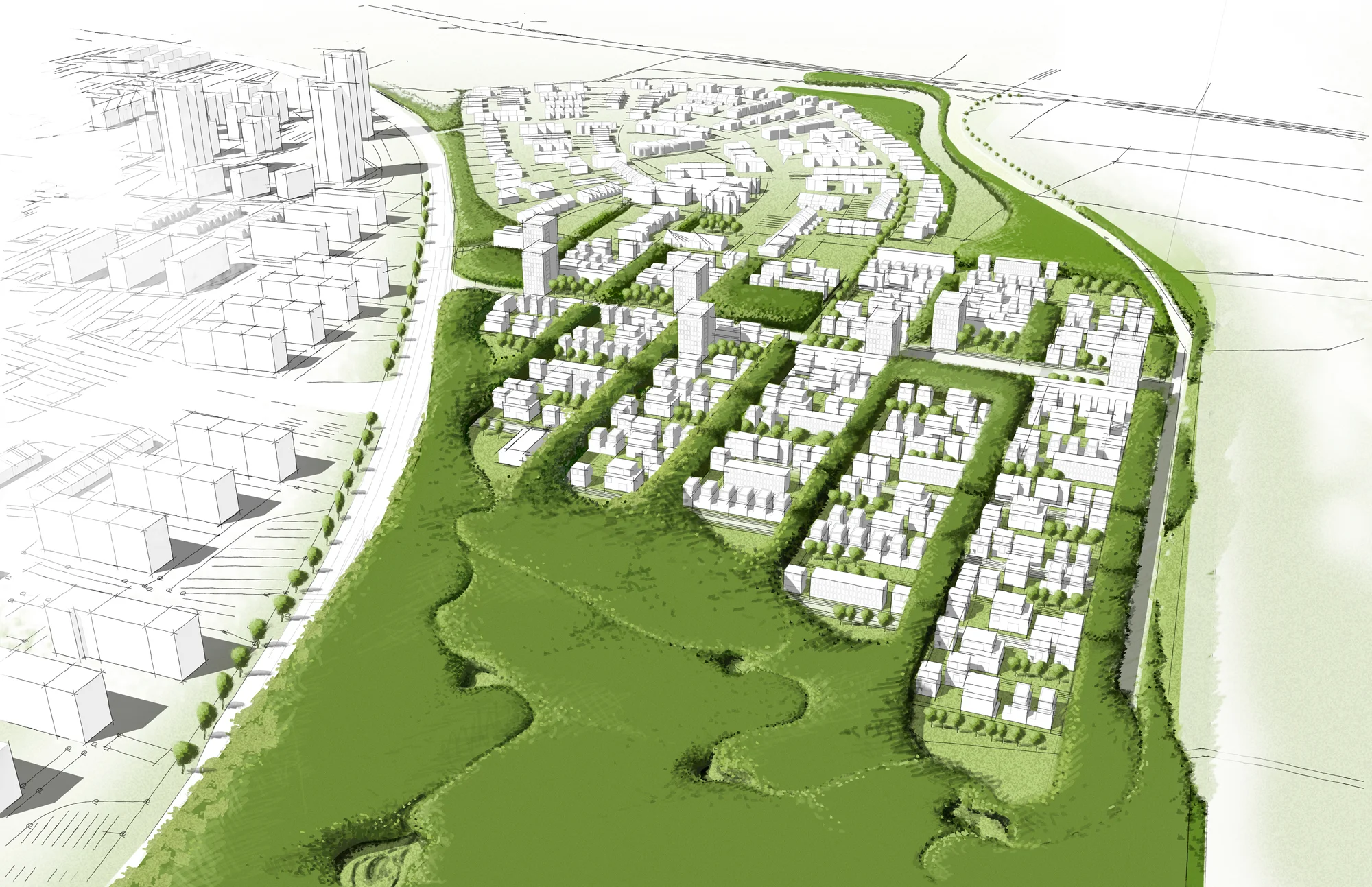 Der frei in das Gebiet wachsenden Natur steht eine strenge schachbrettartige städtebauliche Grundordnung gegenüber. Ein auf den ersten Blick rigides Grundraster innerhalb eines Blockes und in der Gesamtheit, entwickelt bei genauer Betrachtung ein für private Bauherren wie Investoren sehr freies und individuelles Entwicklungspotential. So kann das Gebiet, ähnlich dem Entwicklungsprozeß einer Stadt, langsam entstehen ohne dass Baulücken das Gebiet im Gesamten unvollständig erscheinen lassen. Innerhalb des Blocks und auf dem individuellen Grundstück entstehen sehr lebendige und unterschiedliche Lebensformen und Nachbarschaften, die Interaktion und Individualität miteinander verbinden.