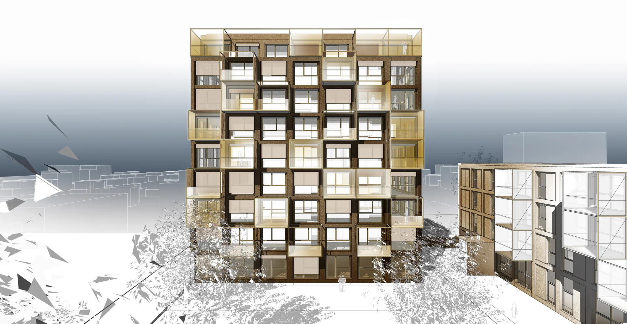 Die gestalterische Qualität fokussiert sich ausschließlich auf die Ausführung der hinterlüfteten Fassade und der vorgelagerten und selbsttragenden Balkons.