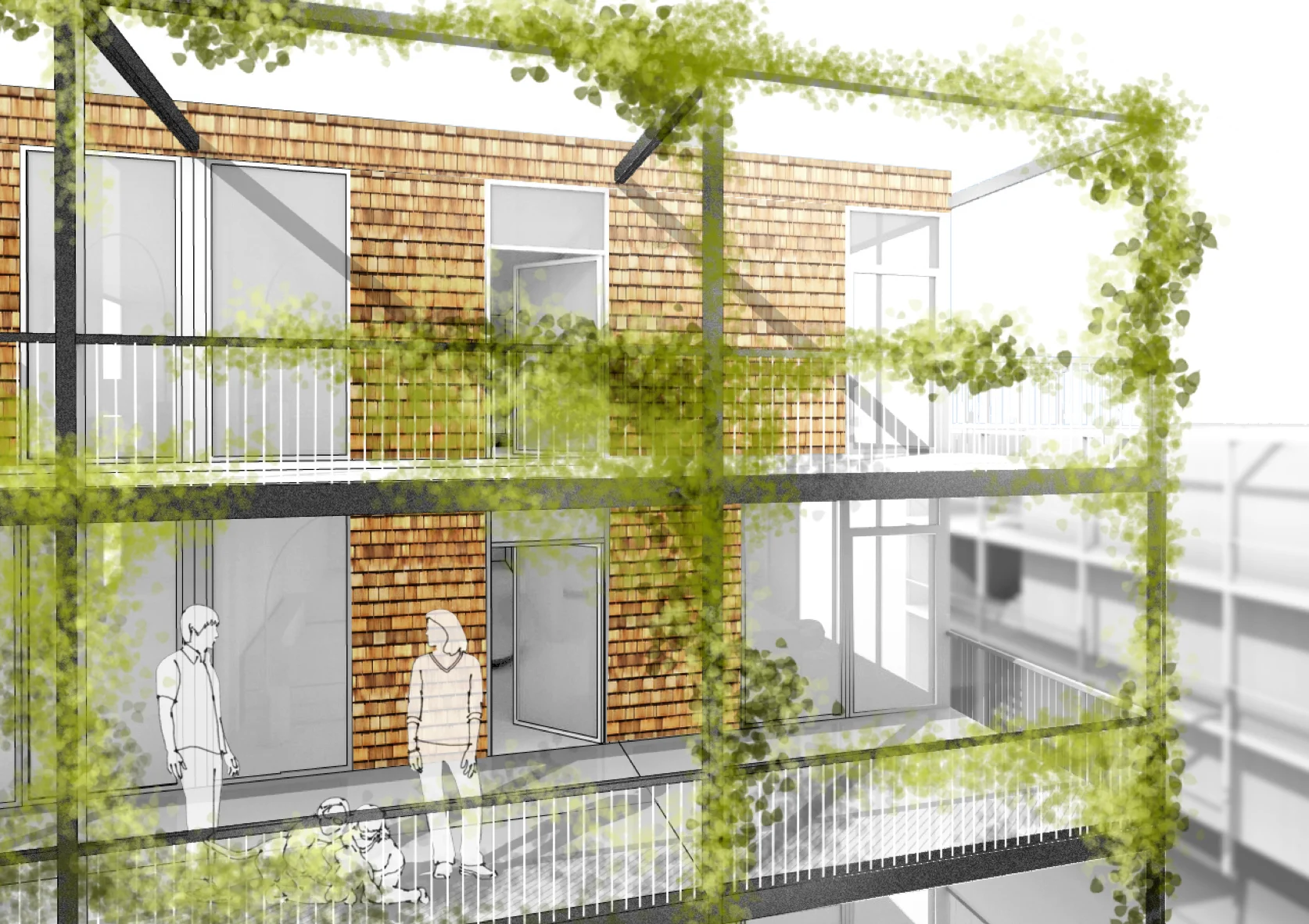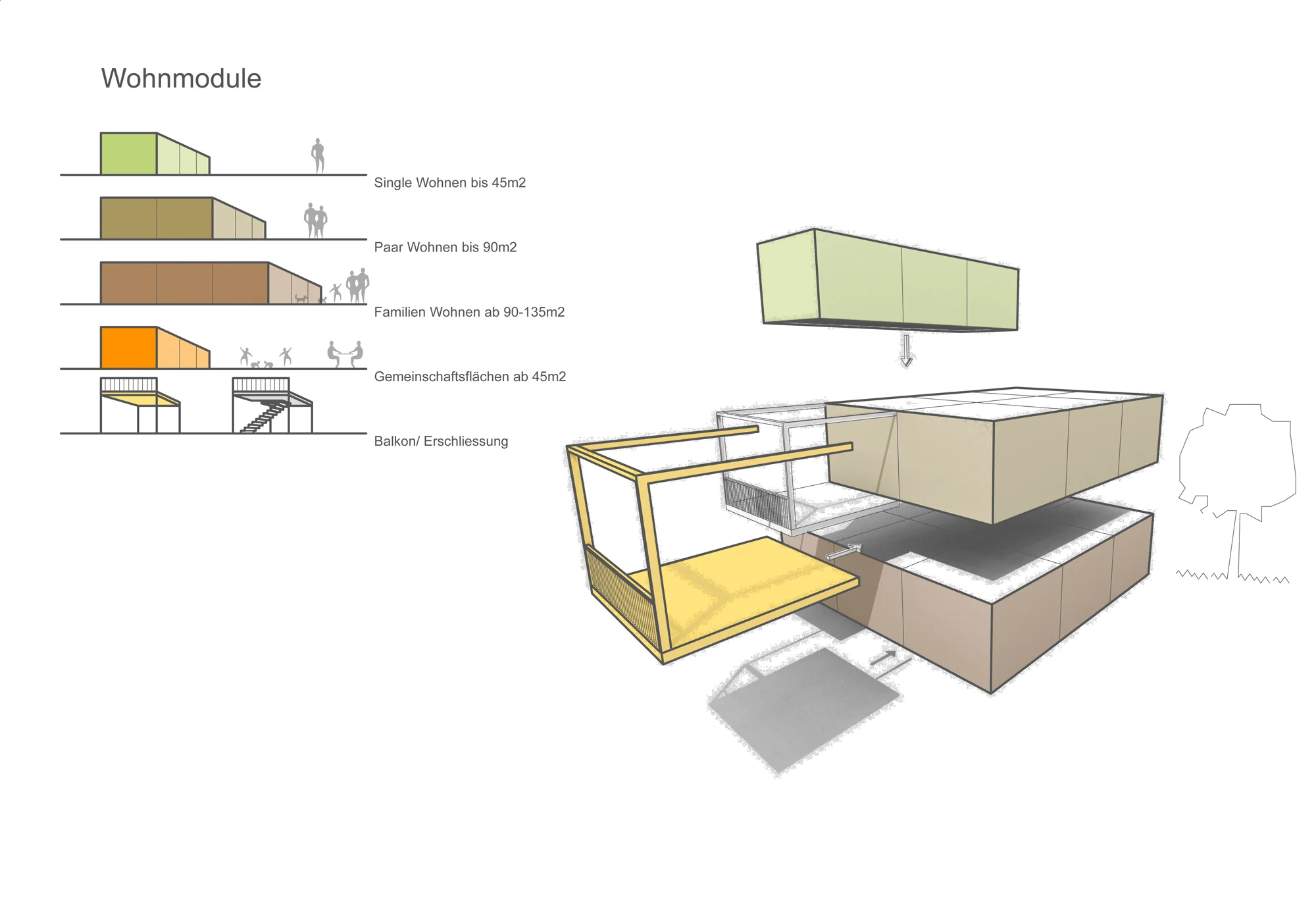 Im vorliegenden Entwurf wurden die Wohnmodule so arrangiert, dass sich die großen Familienwohnungen vornehmlich im Erdgeschoss mit Anbindung an den Garten befinden. Die Apartments wurden über die verschiedenen Baukörper und Geschosse gestreut, befinden sich aber meist in der Nähe der Gemeinschaftsräume an den Erschließungskernen. Der große Anteil an mittleren Familienwohnungen verteilt sich über den gesamten Baukörper, ist Gartenwohnung, Dachgeschosswohnung, oder auch eine Einheit an einem großzügigen Laubengang.