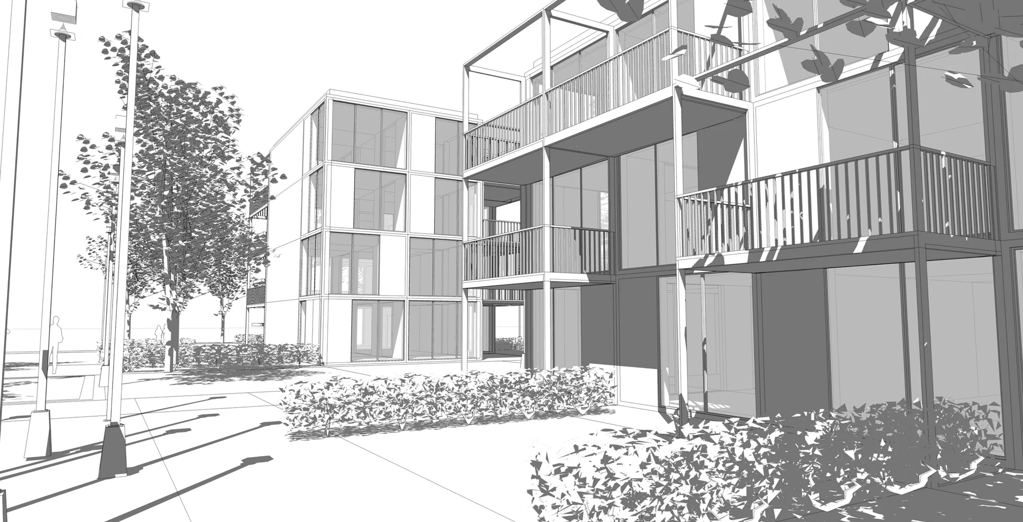 - Bereitstellung eines großzügigen Angebots an privatem und gemeinschaftlichem Freiraum in Kombination mit der gemeinschaftlichen Erschließung.