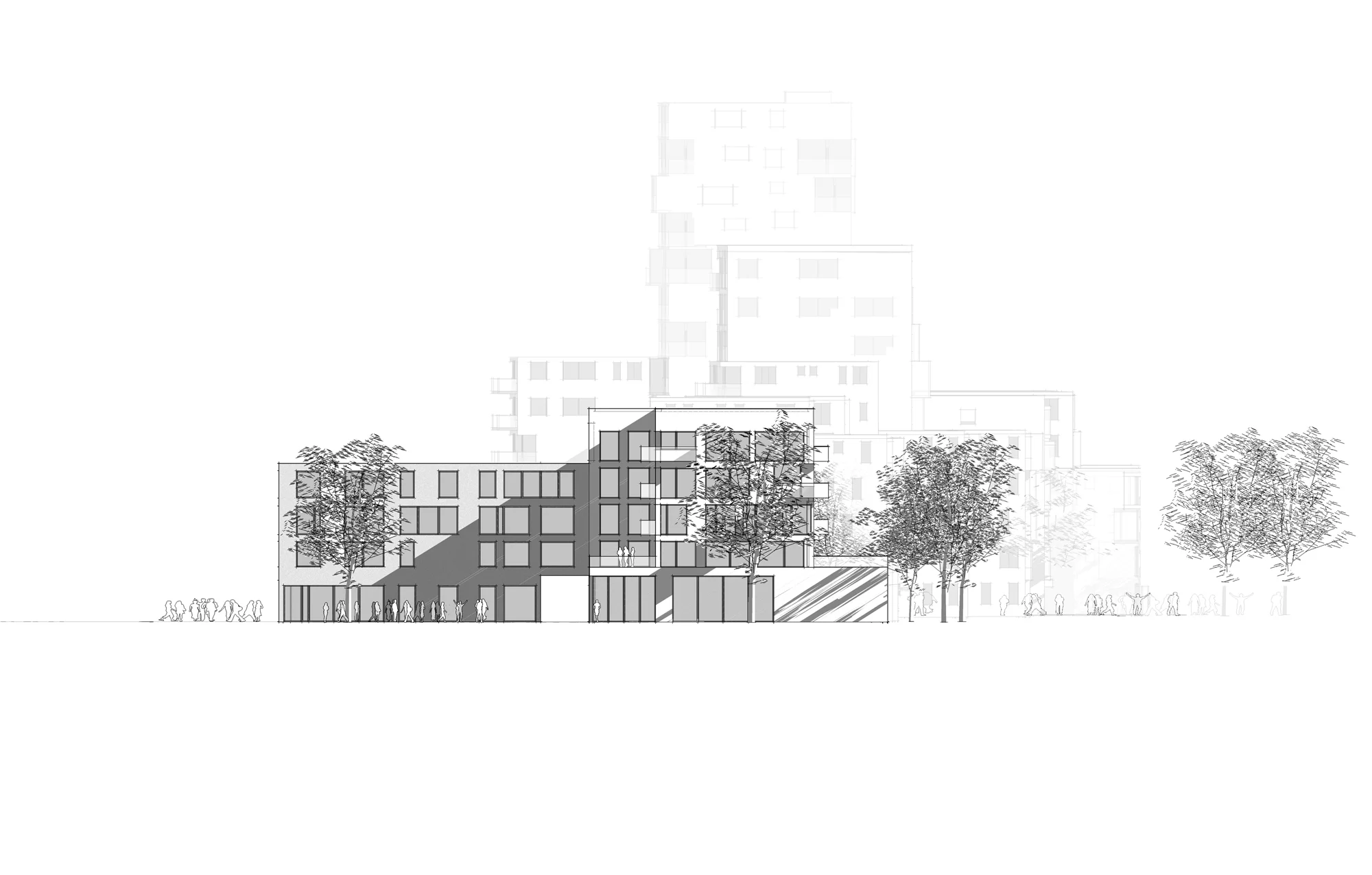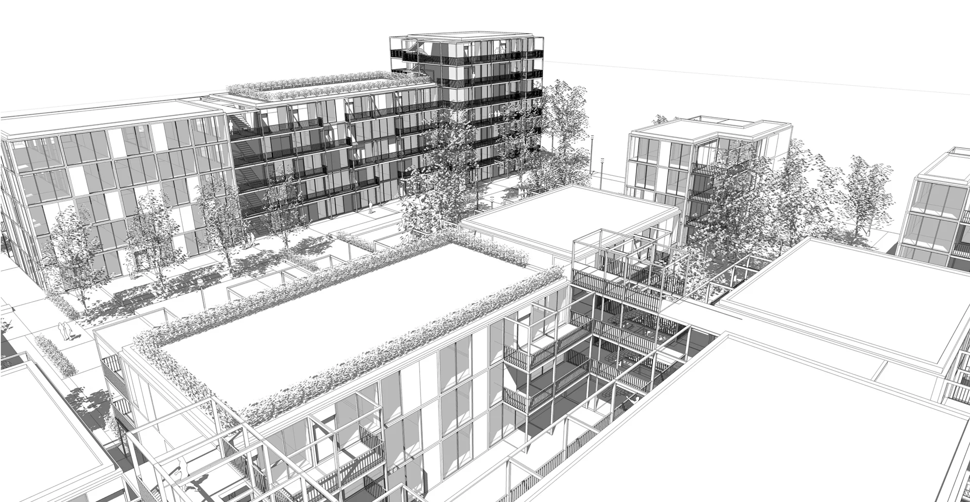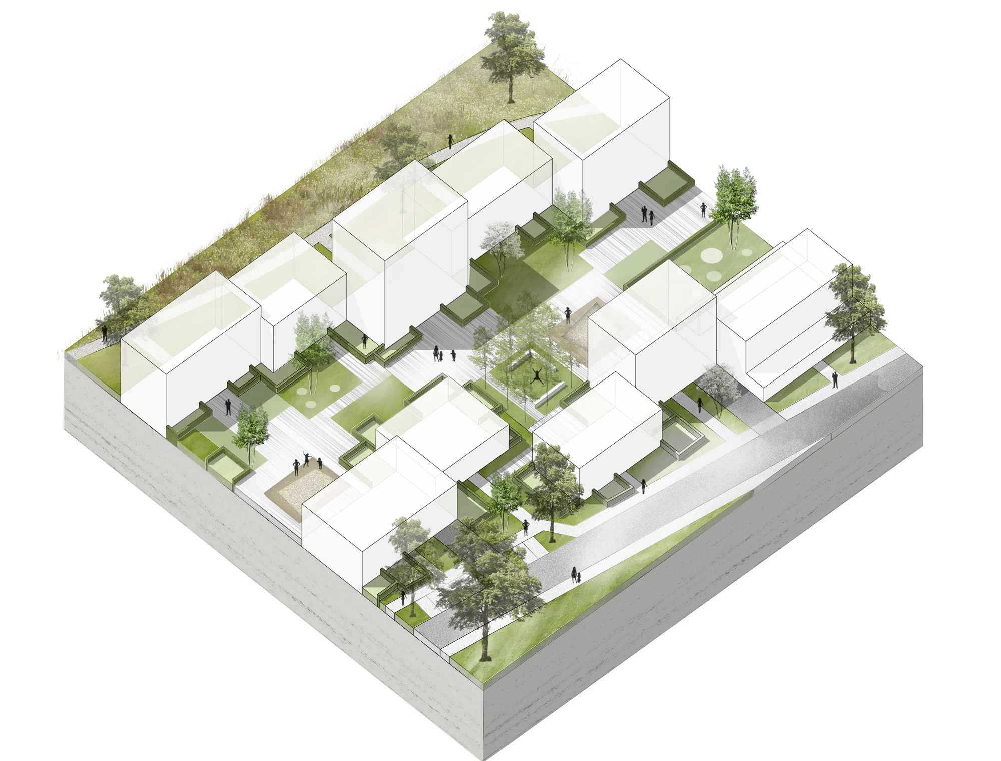 Das neue Ensemble besteht aus vier Baukörpern, die sich um einen gemeinschaftlich nutzbaren Innenhof gruppieren. Diese städtebauliche Figur schafft nicht nur eine klare räumliche Fassung, sondern etabliert auch ein soziales Zentrum, das über die reine Wohnnutzung hinausgeht. Im Mittelpunkt des Hofes befindet sich ein öffentlicher Spielplatz, der sowohl den zukünftigen Bewohnerinnen und Bewohnern als auch der umliegenden Nachbarschaft zur Verfügung steht. Der Freiraum ist landschaftsplanerisch differenziert gestaltet, mit vielfältigen Vegetationszonen, Aufenthaltsbereichen und Bewegungsflächen. Dabei entsteht ein fließender Übergang zwischen privatem, halböffentlichem und öffentlichem Raum.