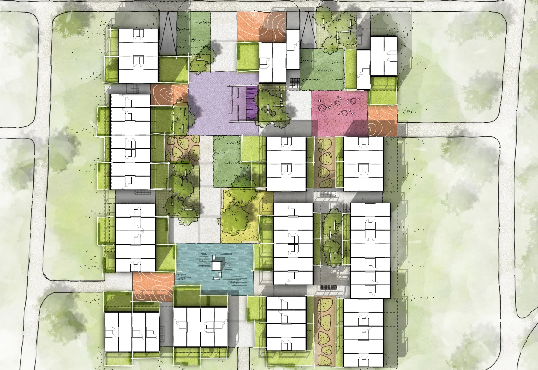 Die Vorgaben des B-Planes sehen eine klare Trennung und Unterscheidung der Wohntypologien vor. Der lang gezogene Geschosswohnungsbau im Westen mit einem hohen Baukörper an der Straße, zwei Stadtvillen im Norden, einer Reihenhaustypologie im Südwesten und Atriumhäuser im Südosten. Der städtebaulicher Entwurfsansatz sieht vor diese teilweise großmaßstäbliche und die Wohnformen unterscheidende städtebauliche Struktur aufzubrechen und stattdessen durch eine kleinmaßstäblichere, durchmischte und flexiblere zu ersetzen. Statt fixe Baukörper mit klar definierten Wohntypologien werden nun „Möglichkeitsräume“ geschaffen, die im Laufe der Planung und des Lebenszyklus des Gebäudes angepasst werden können. Statt bisher 6 Baukörper arrangieren sich nun 13 Baukörper um den zentralen Nachbarschaftshof. Aus großen Hausgemeinschaften werden kleinere Nachbarschaften.