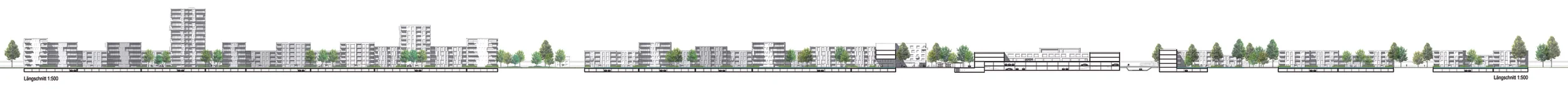 Das Projektgebiet erhält dadurch eine übergeordnete Rhythmisierung, welche durch die Gliederung von zusammenhängenden, größeren Freiräumen und Plätzen verstärkt wird. Diesen Freiraum- und Platzsituationen sind die bürgerschaftlichen, sozialen und gewerblichen Nutzungen zugeordnet.